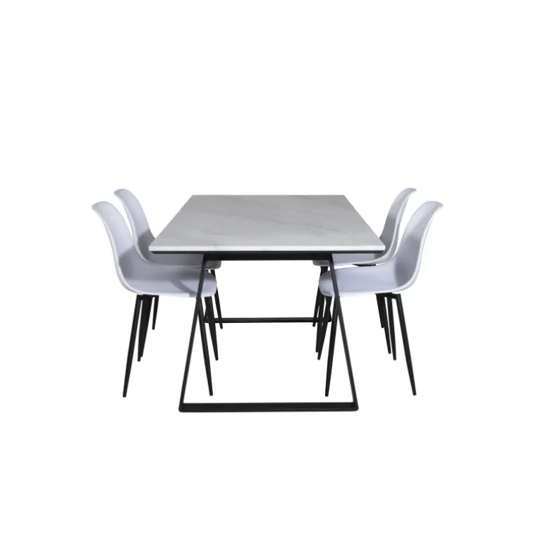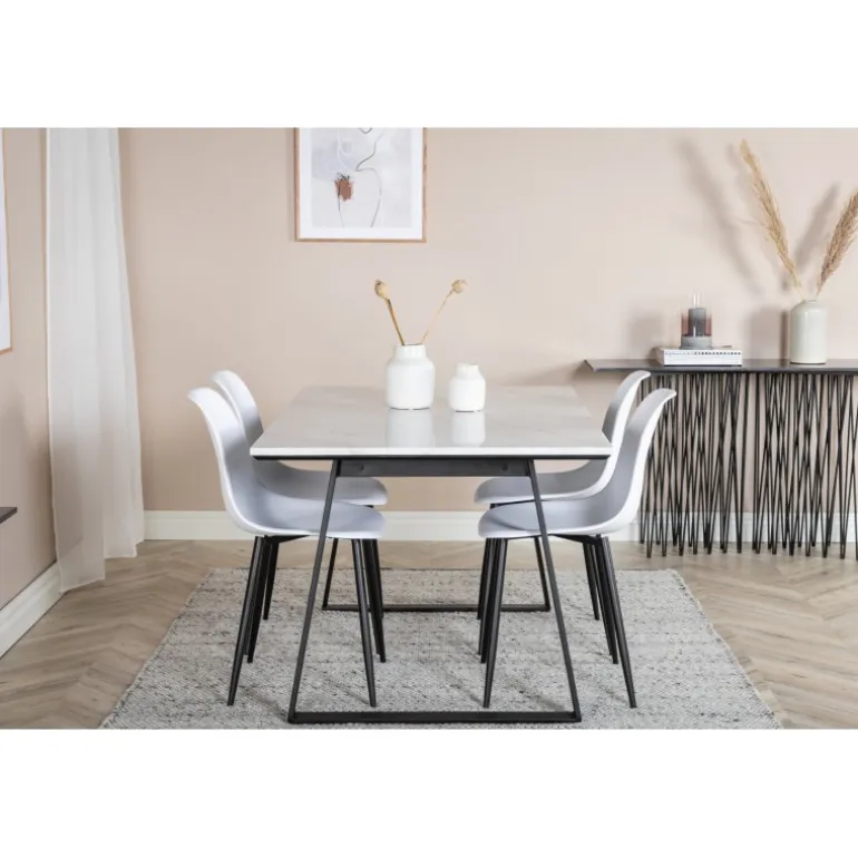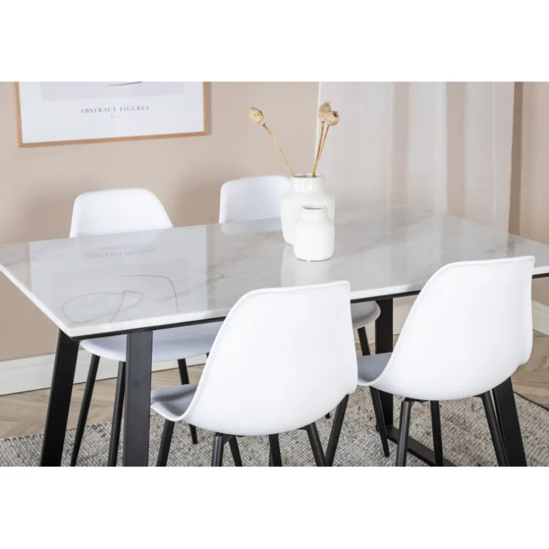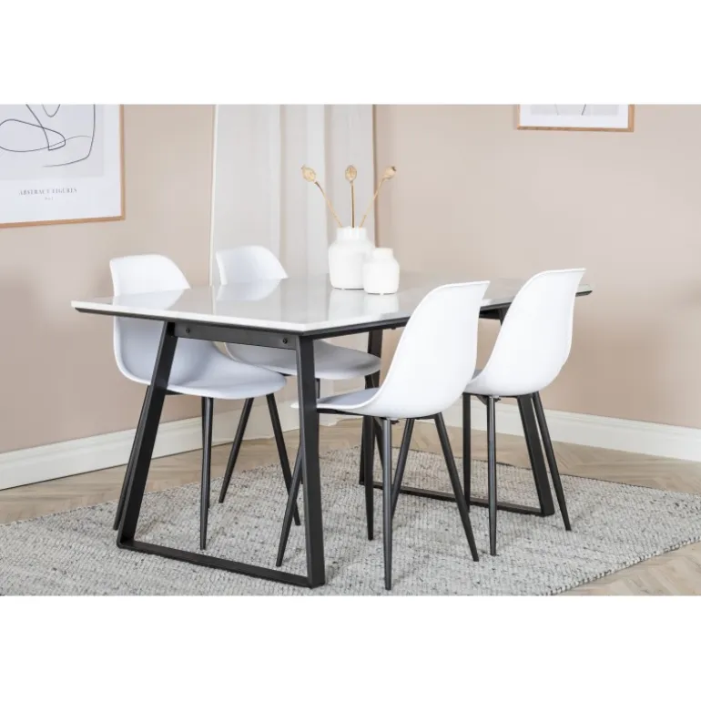Oplev den moderne luksus med vores Estelle Rektangulære Spisebordssæt. Dette sæt kombinerer en elegant marmor spisebord med komfortable stole fra Polar serien. Perfekt til både hverdagsbrug og festlige lejligheder, giver dette Spisebordssæt et sofistikeret touch til din spisestue. Med materialer som marmor, plastik og stål samt en stilfuld sort og hvid farvepalet, passer dette sæt perfekt ind i enhver moderne boligindretning.