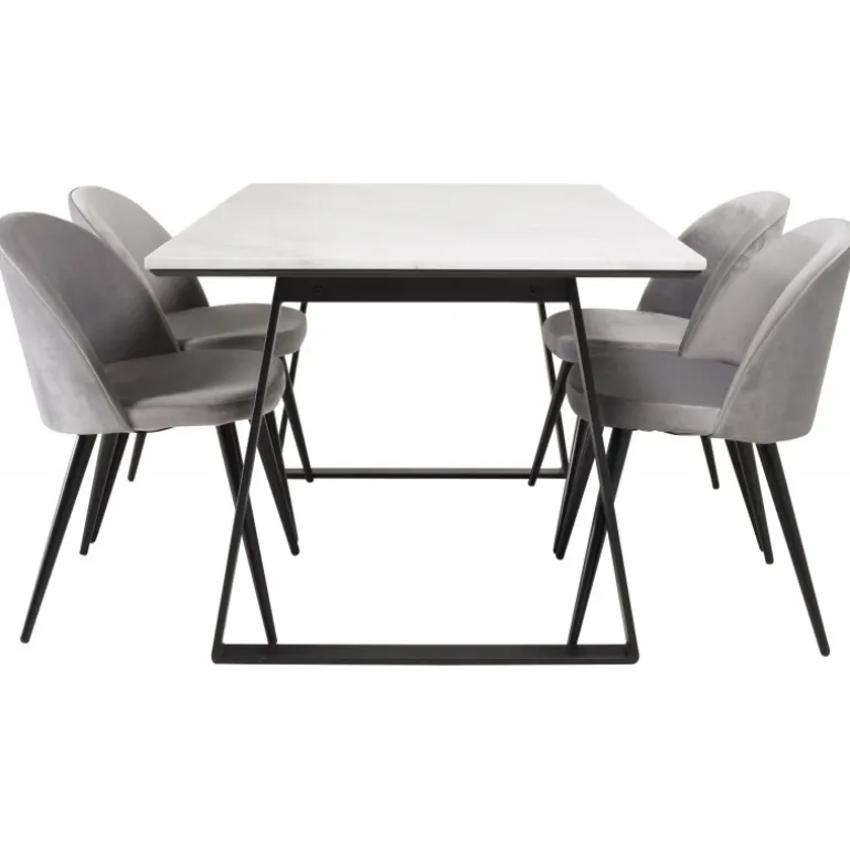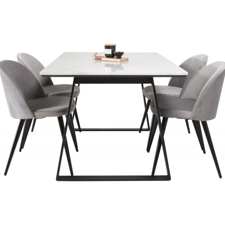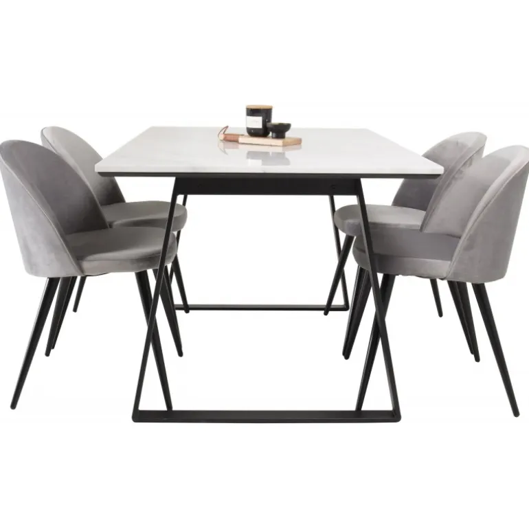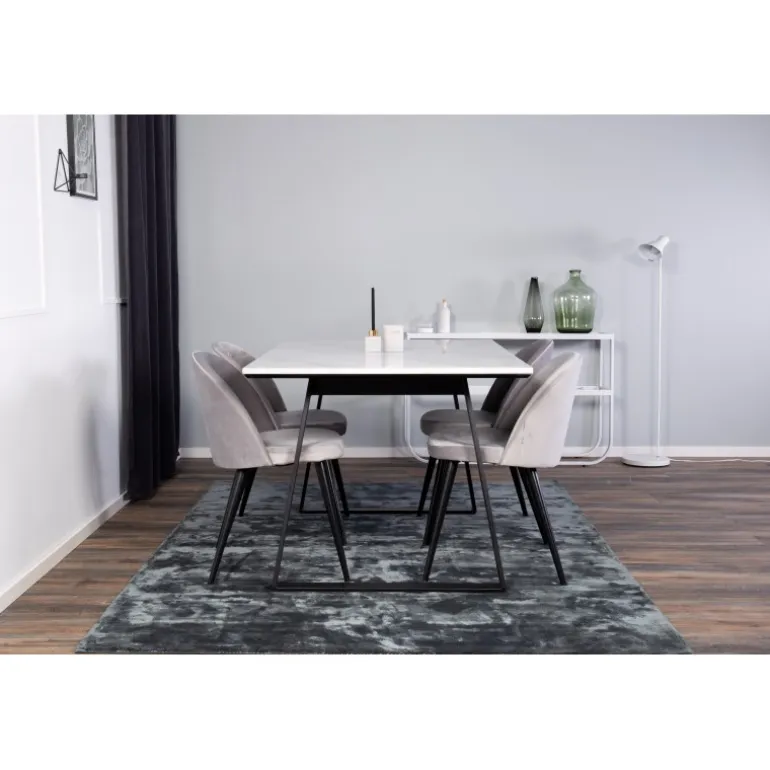 Kombinering af forskellige farver og materialer på stole og borde skaber ofte stor succes. Her får du et elegant spisebord fra Estelle og vores grå spisestuestole fra Serein Velvet – moderne, komfortable og tidløse.