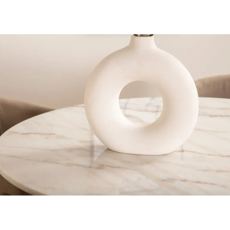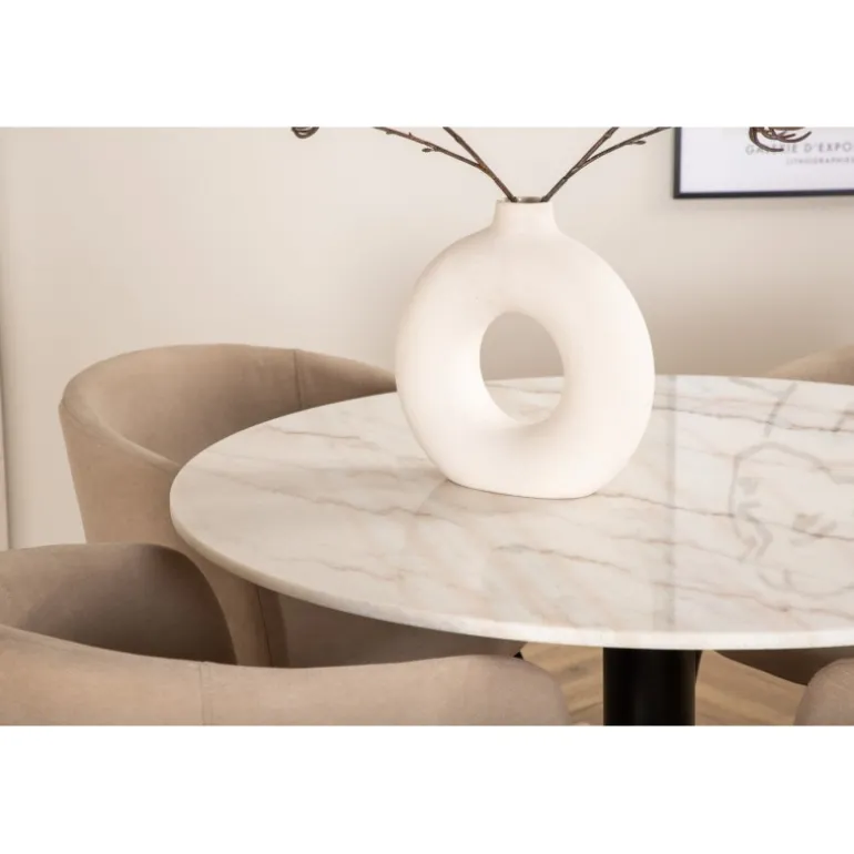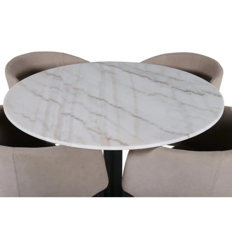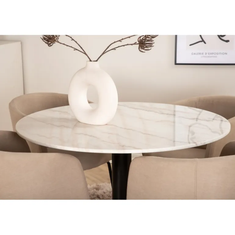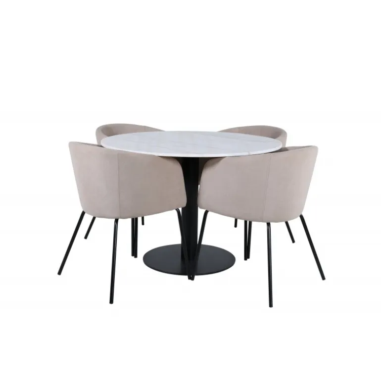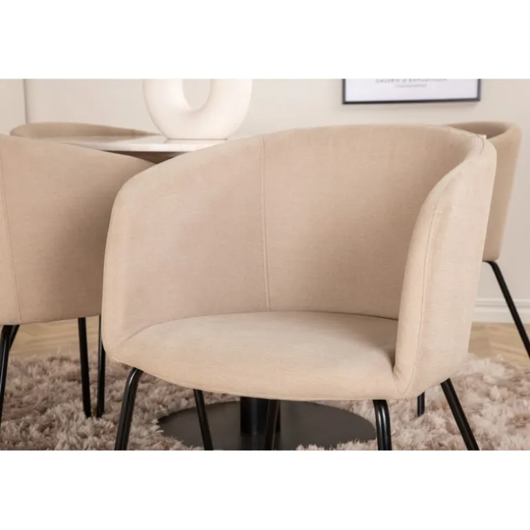 Hvad mere kan du ønske dig end et Spisebordssæt, der både er komfortabelt, stilfuldt og giver rummet en luksuriøs følelse? Det er præcis, hvad denne moderne kombination tilbyder! Vores runde spisebord Estelle er både elegant og praktisk. Bordet har en blank bordplade i hvid, plettet marmor og en cylindrisk underdel i sort metal. Her sammen med smagfulde spisebordsstole fra Berit-serien. Stolebenene er i sort jern, og sædet er fuldt beklædt med blød, beige polyesterlinned. Sid behageligt og nyd hyggelige måltider!