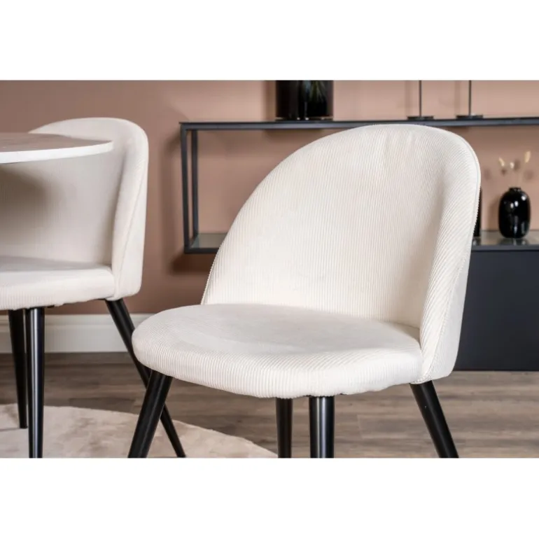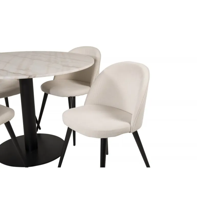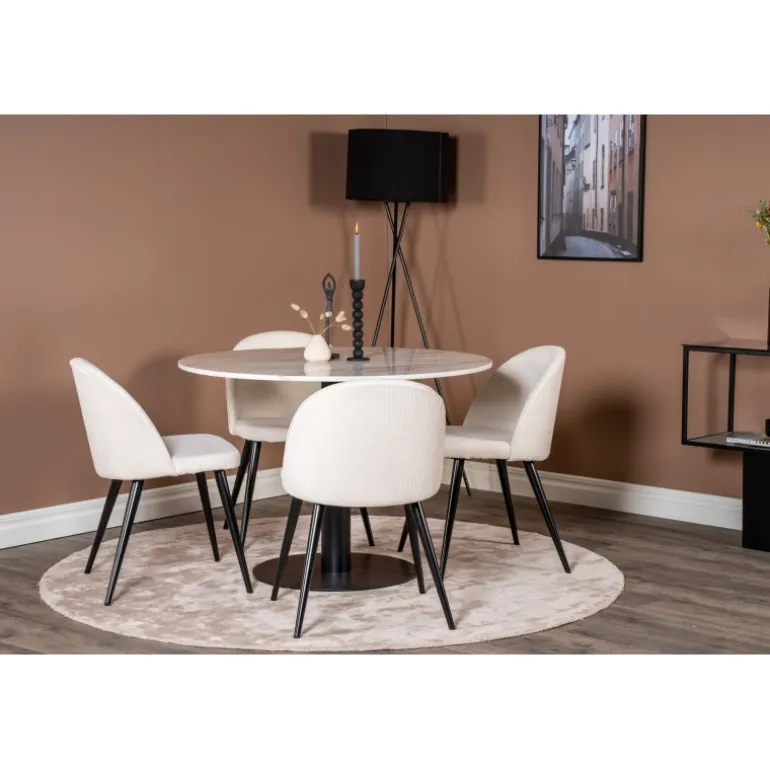 Oplev det moderne og elegante Estelle Rundt Spisebordssæt. Dette sæt kombinerer en stilfuld marmorbordplade med komfortable stole fra Velvet-serien. Perfekt til hyggelige middage og sociale sammenkomster. Bordet og stolene fås i forskellige farver som beige, sort og hvid, hvilket gør det nemt at matche med din indretning. Saml familie og venner omkring dette smukke spisebordssæt og nyd gode måltider i en indbydende atmosfære.