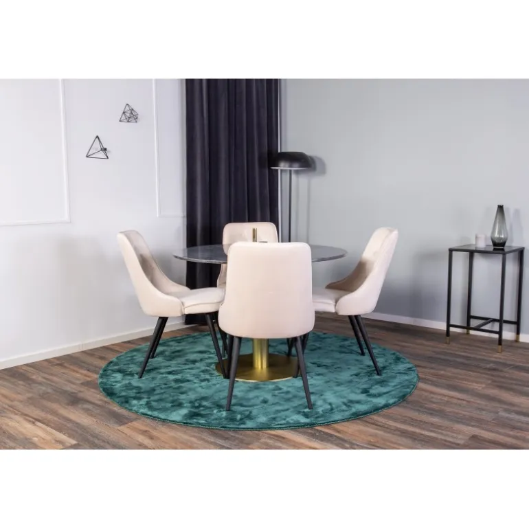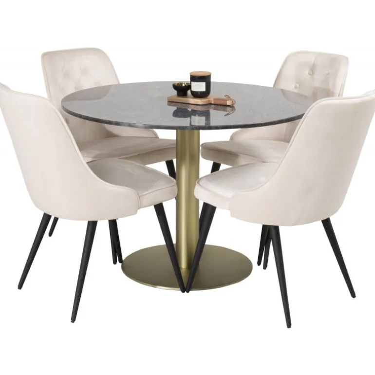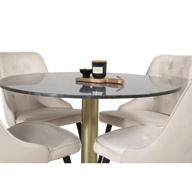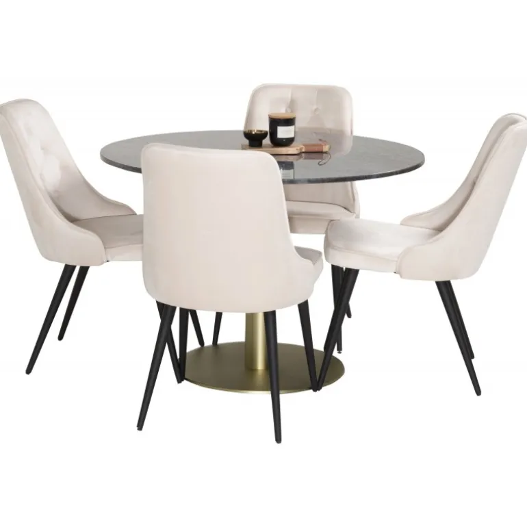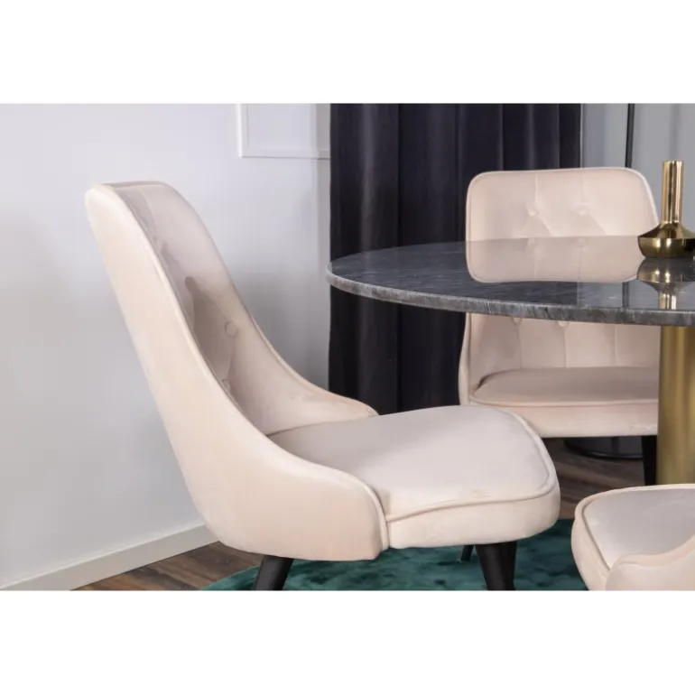 Spisebord Estelle i et slankt design, sammen med beige spisebordsstole Velvet – den perfekte kombination for dem, der ønsker en trendy Spisebordssæt. Høj siddekomfort på stolene inviterer til lange og vidunderlige øjeblikke for socialt samvær!