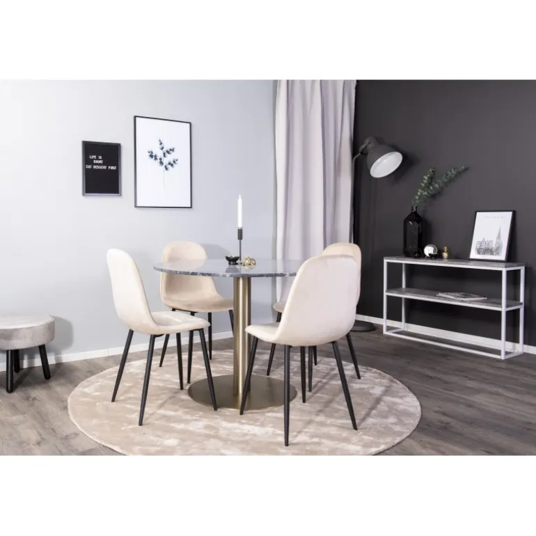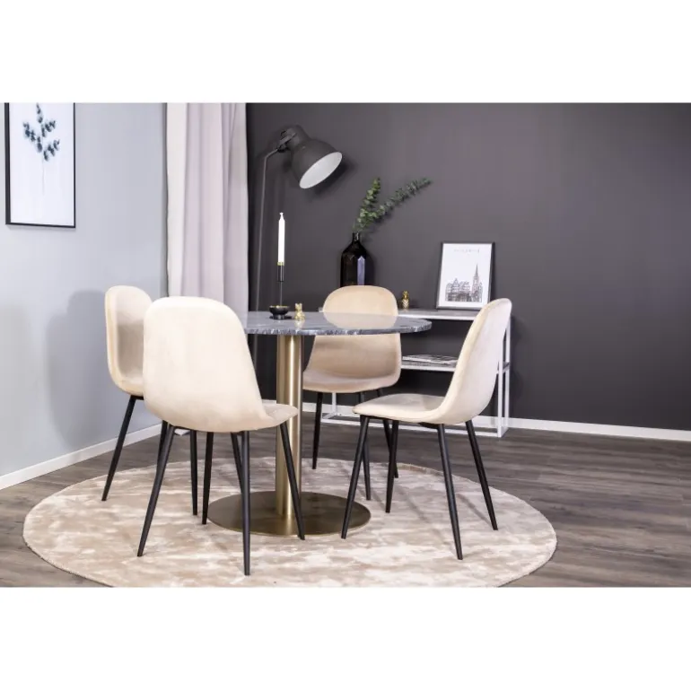 Vores lækre runde spisebord Estelle i en stilfuld marmorlignende finish sammen med vores beige spisebordsstole Polar. Her får du en Spisebordssæt, der direkte udstråler luksus og elegance. “Pynt op eller ned” din Spisebordssæt med anden indretning rundt omkring, lige så godt til hverdagen som til fest!