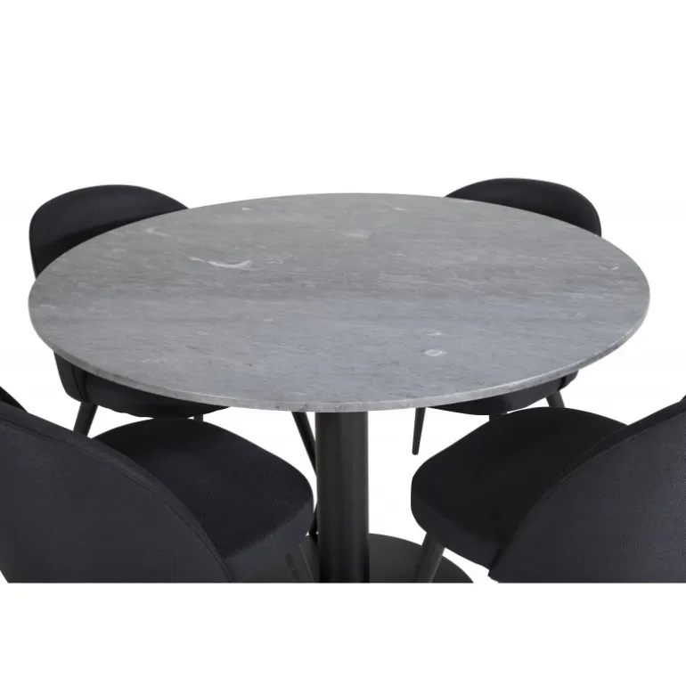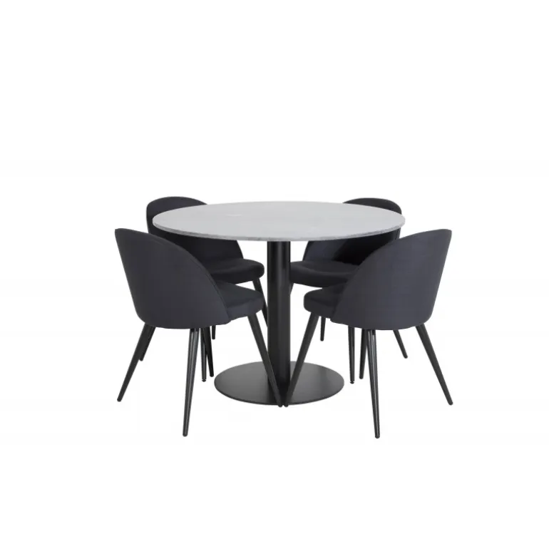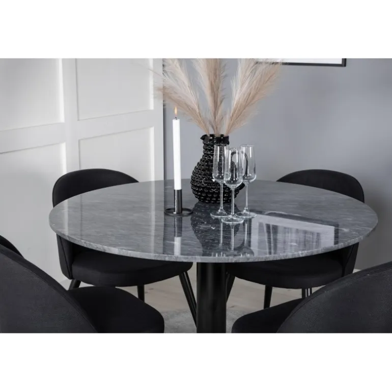 Estelle Rund Spisebordssæt kombinerer en stilfuld spisebord i smukt marmor fra Estelle-serien med bløde og komfortable spisestole fra Velvet-serien. Det elegante sorte design gør det til et ideelt valg for dem, der elsker at tilbringe tid ved bordet og nyde godt selskab. Bliv siddende i timevis og oplev en uforglemmelig spiseoplevelse med venner og familie!