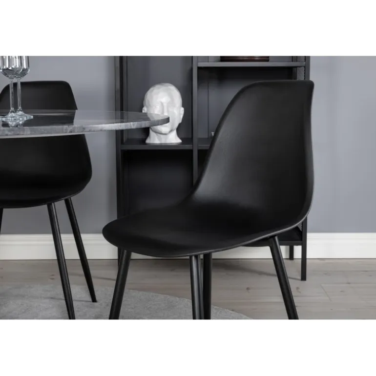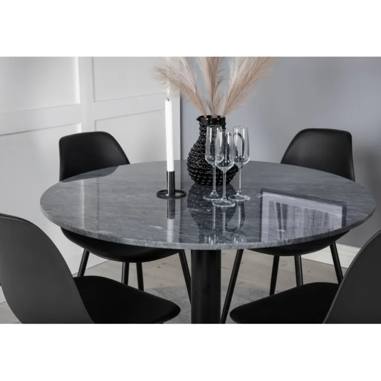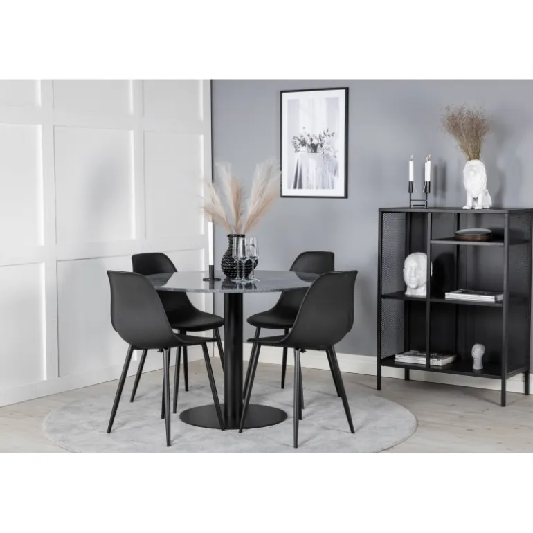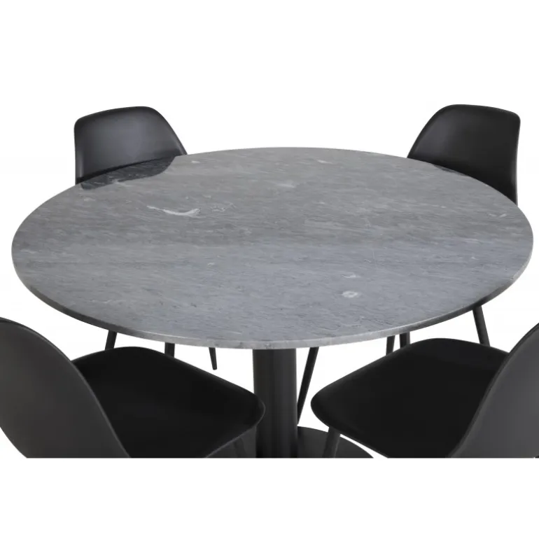 Med det stilfulde spisebord i smuk marmor fra Estelle-serien sammen med spisebordsstole fra Polar-serien får du en kombination af moderne, hyggelig og tidløs indretning! Dette sæt er perfekt til enhver spisestue, hvor du ønsker at skabe en indbydende og elegant atmosfære. Bordet har en mørkegrå marmorplade og robuste stålben, mens stolene er lavet af plastik og stål for maksimal holdbarhed.