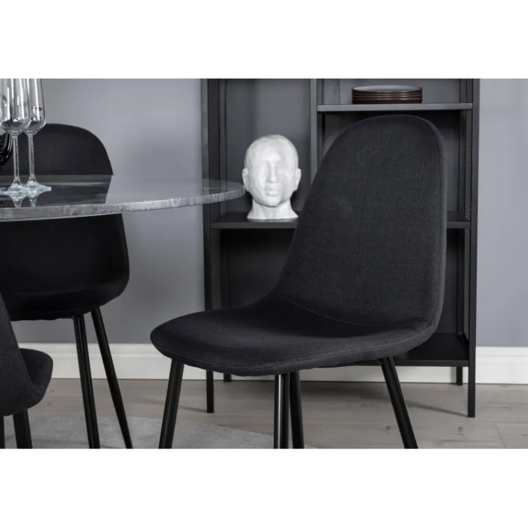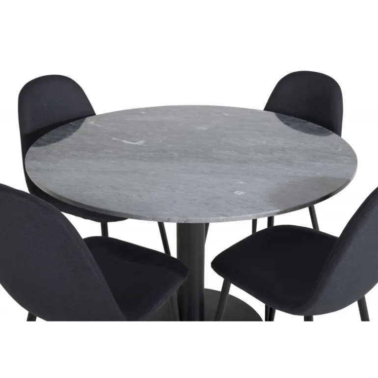 Et elegant spisebord med marmorbordplade i Estelle-serien kombineret med stilfulde stole fra Polar-serien. Dette Spisebordssæt er perfekt til dem, der ønsker at skabe en hyggelig og moderne stemning i hjemmet. Med sin sorte farve og høj kvalitet materialer som bøjet træ, skum, marmor og stål, giver dette sæt et sofistikeret look. Vær opmærksom på, at montering er påkrævet.