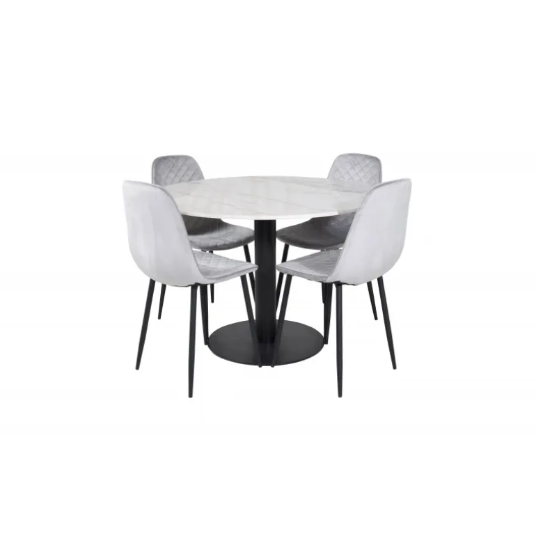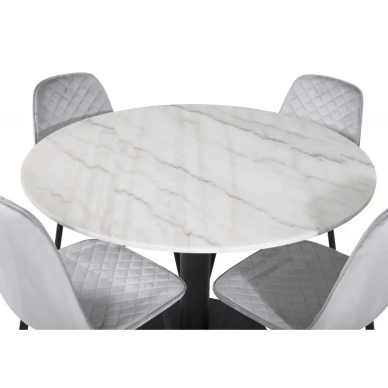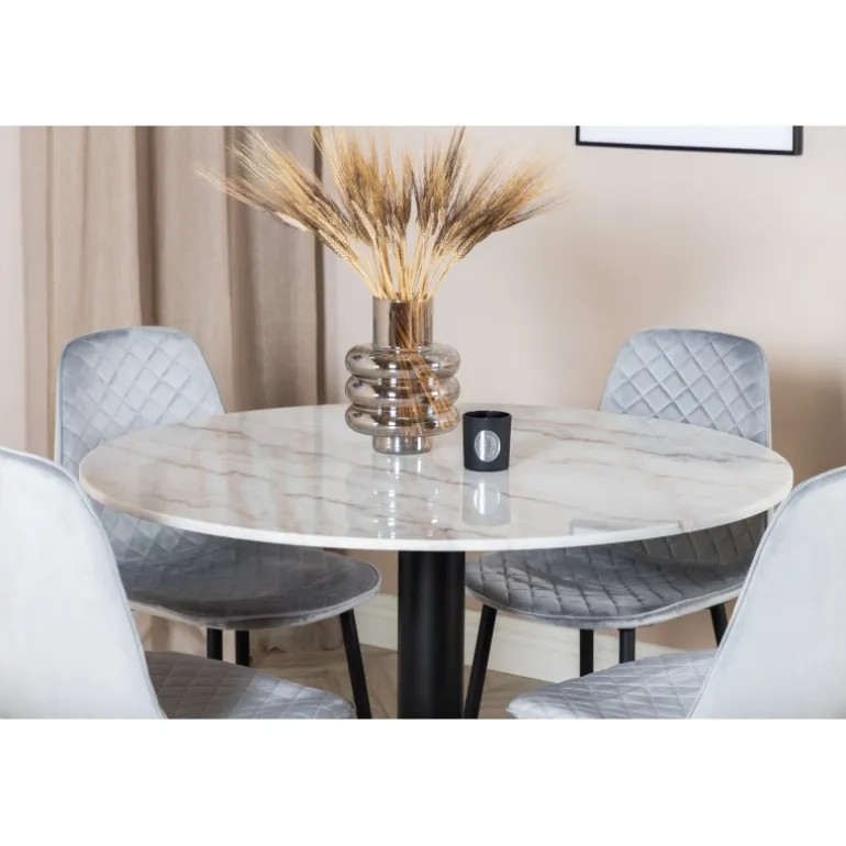 Det elegante spisebord i smuk marmor fra serien Estelle kombineret med stilfulde spisebordsstole fra serien Polar – et Spisebordssæt, der udstråler luksus og inviterer til mange vidunderlige sociale øjeblikke. Sættet er designet til at tilføre et sofistikeret touch til dit hjem og skabe en indbydende atmosfære for dine gæster. Med en hvid bordplade og grå stole, er det både funktionelt og æstetisk tiltalende.