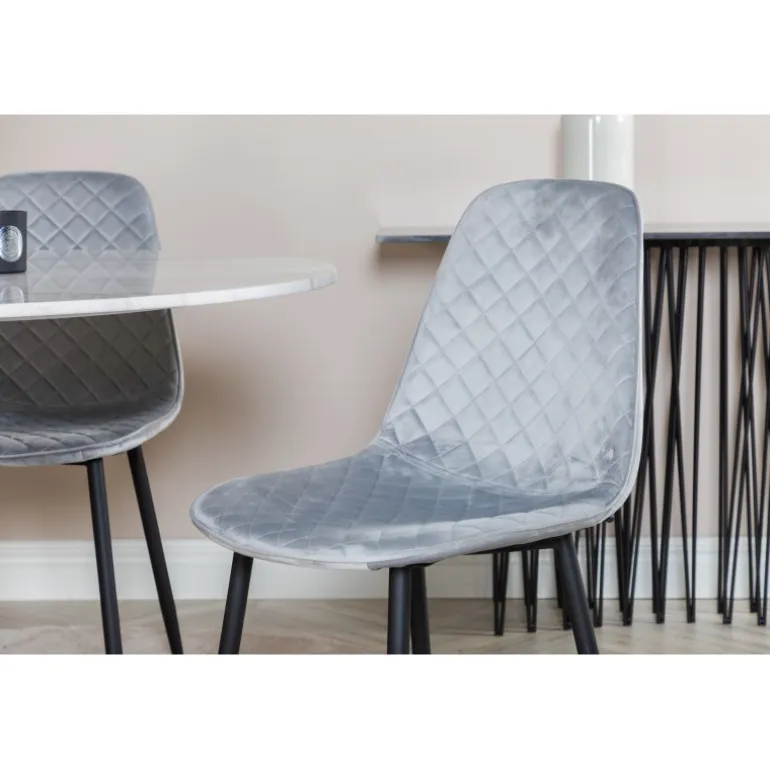- Elegant Design: Smuk marmorbordplade i hvid kombineret med stilfulde grå stole.