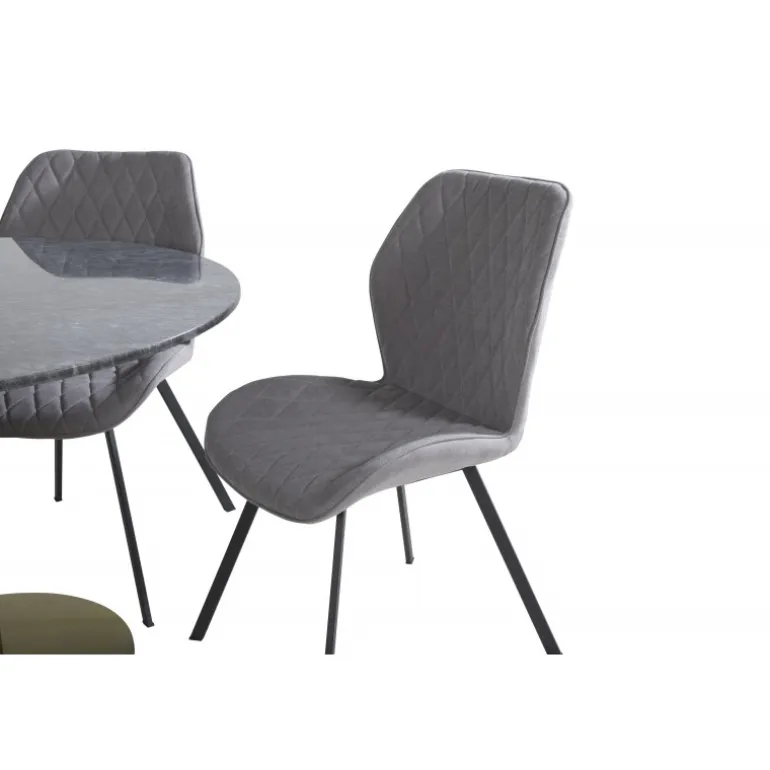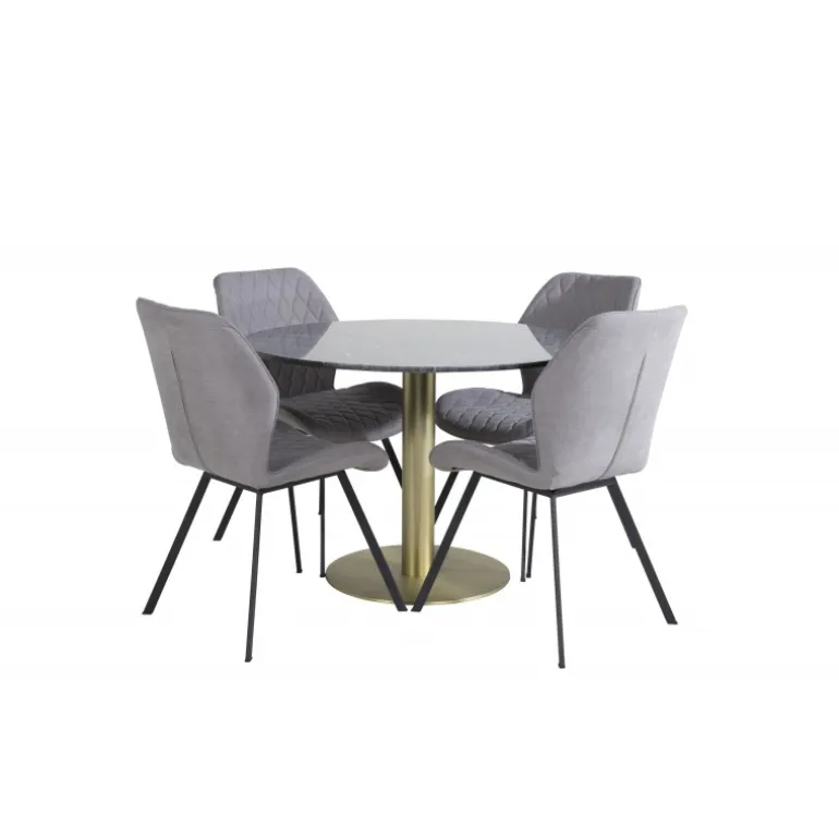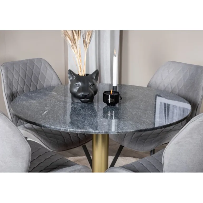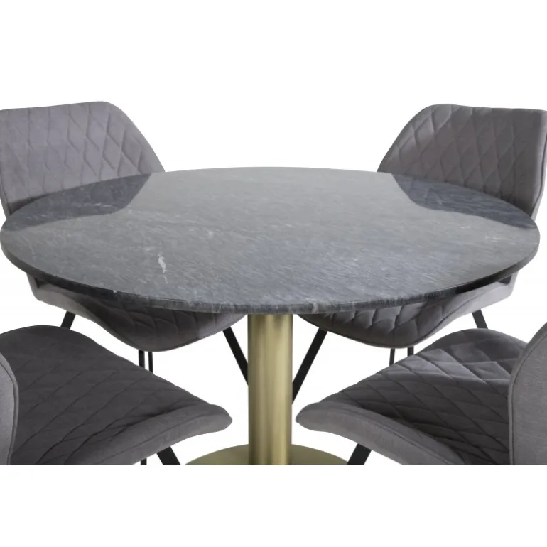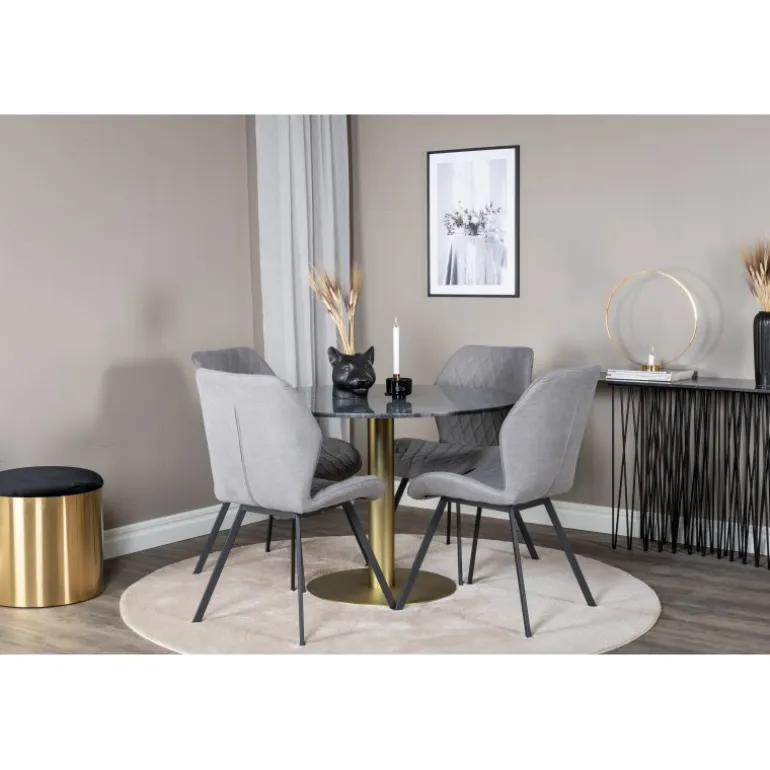 - Materialer af høj kvalitet: Bordplade i sort marmor og stole i grå polyester.
