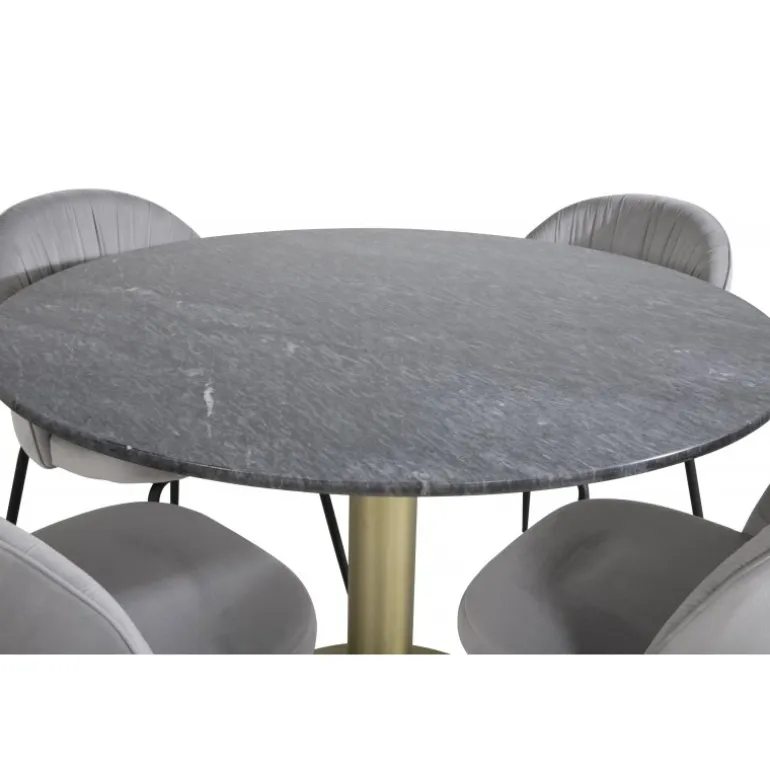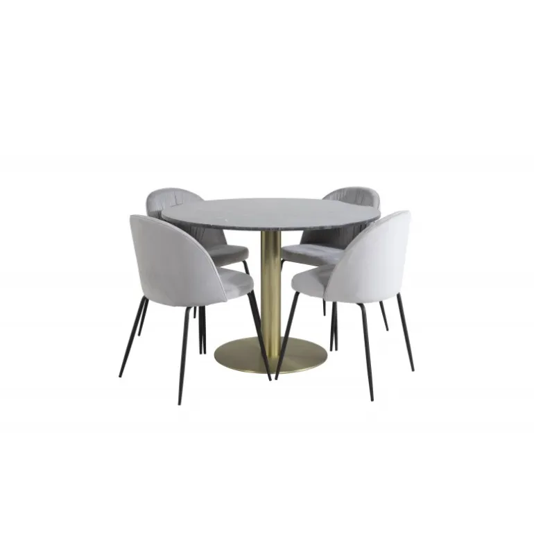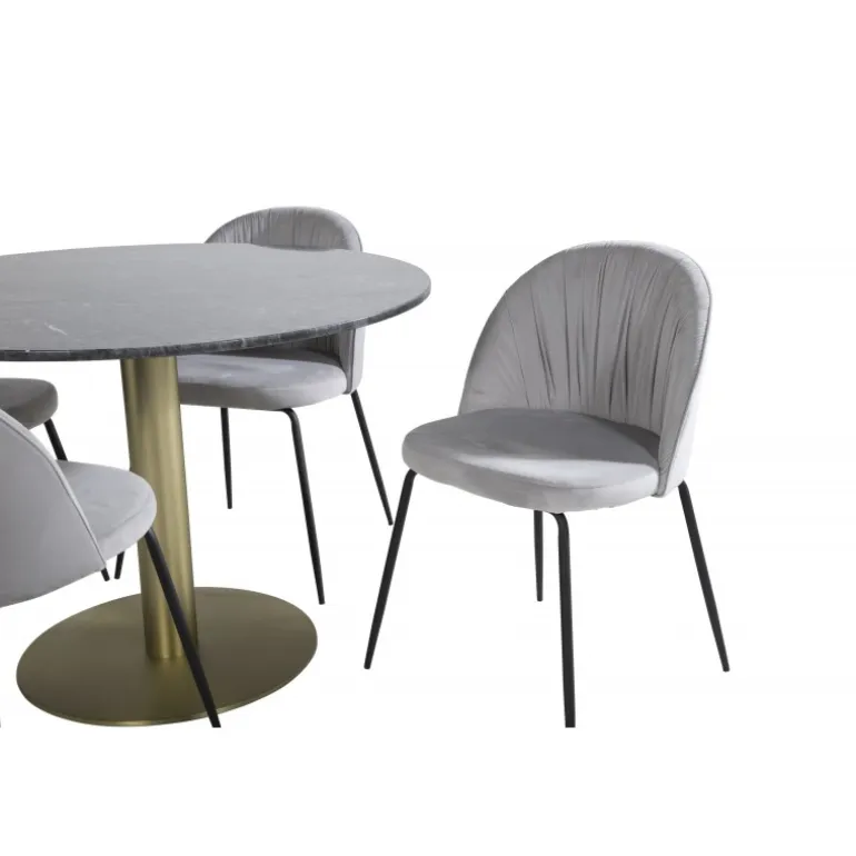 Estelle Rundt Spisebordssæt kombinerer en elegant spisebord i slankt design med stilfulde grå spisestole Wrinkles. Dette sæt er den perfekte kombination for dem, der søger en trendy Spisebordssæt til hjemmet. Bordet har en sort marmor bordplade og gyldne detaljer, mens stolene er lavet af bøjet træ, skum, og stål for maksimal komfort og holdbarhed. Gør dit spisested til et stilfuldt centrum med dette moderne og funktionelle sæt.
