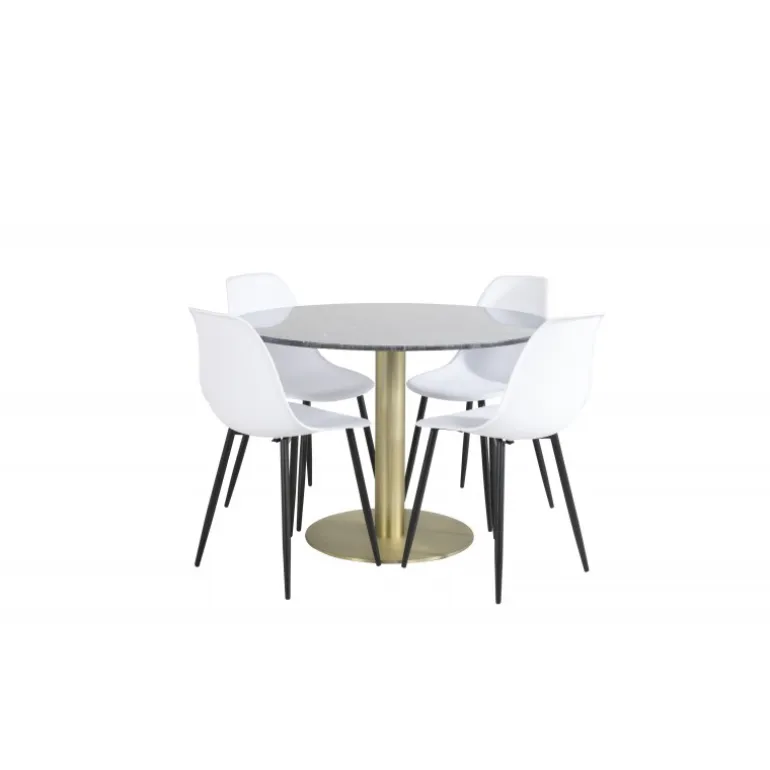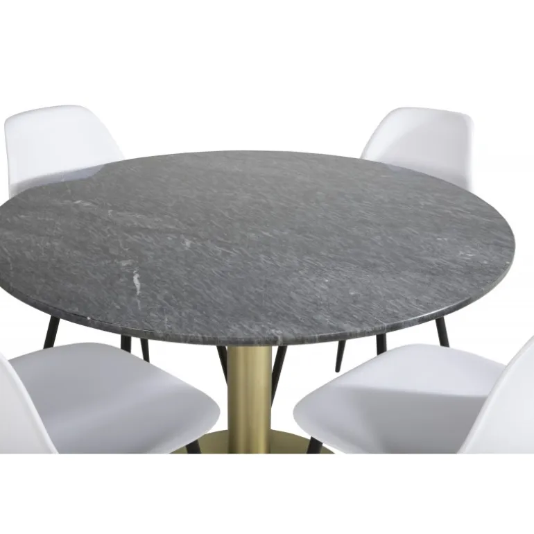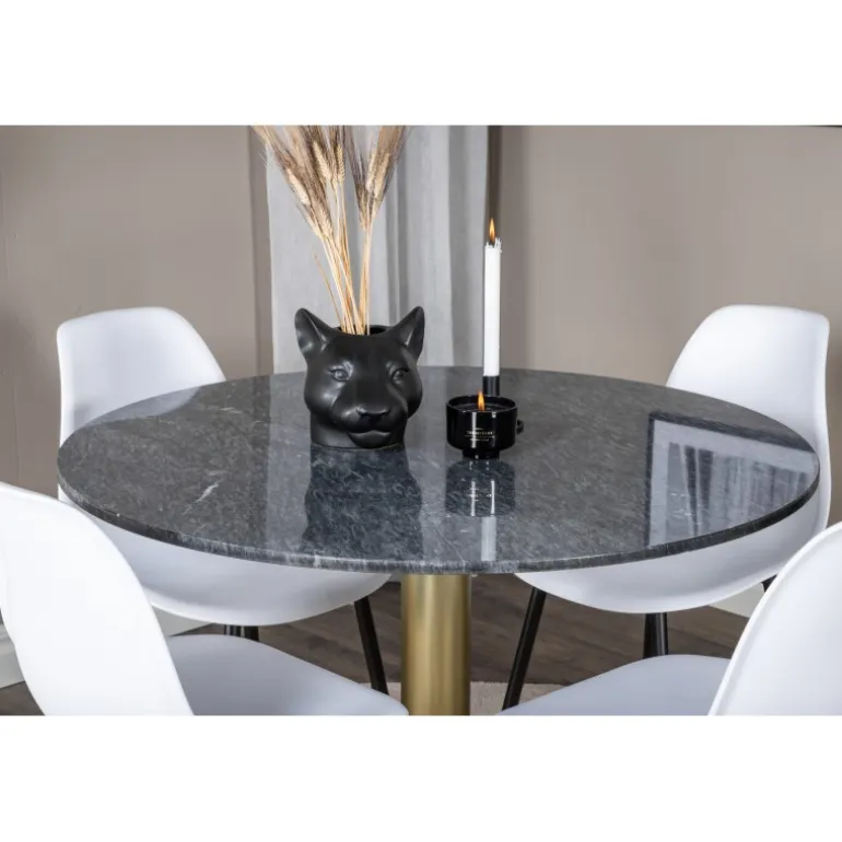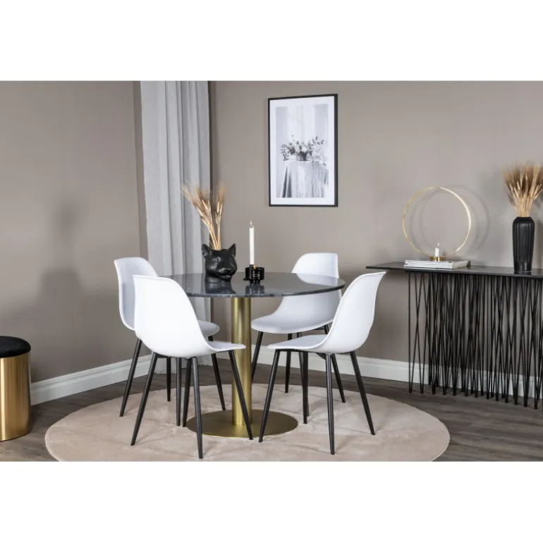 Estelle Rundt Spisebordssæt kombinerer en elegant marmorbordplade med tidløse stole fra Polar-serien. Dette smukke Spisebordssæt er perfekt til at skabe en stilfuld og social atmosfære i dit hjem. Med plads til god mad og hyggelige stunder, bliver dette sæt hurtigt centrum for dine sammenkomster. Bordet og stolene kommer i klassiske farver som sort, guld og hvid, hvilket gør det let at passe ind i enhver indretning. Bemærk, at dette sæt kræver montering.