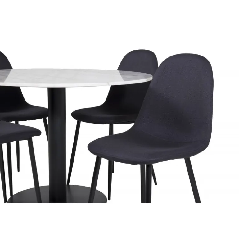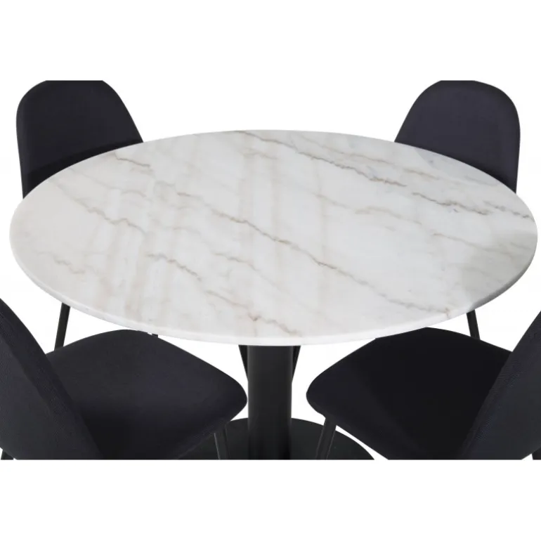 Estelle, et moderne rundt spisebord med en smuk marmor bordplade, giver en elegant og hyggelig atmosfære til dit hjem. Bordet er matchet med sorte stole fra Polar-serien, perfekt til dem, der ønsker at skabe en moderne og indbydende følelse. Dette Spisebordssæt er ideel til dig, der søger et stilfuldt og funktionelt møbel til din spisestue.