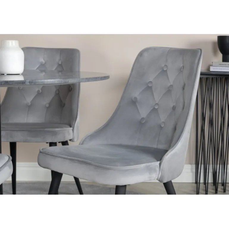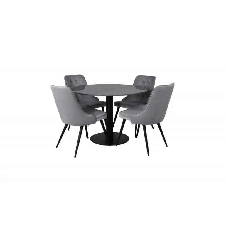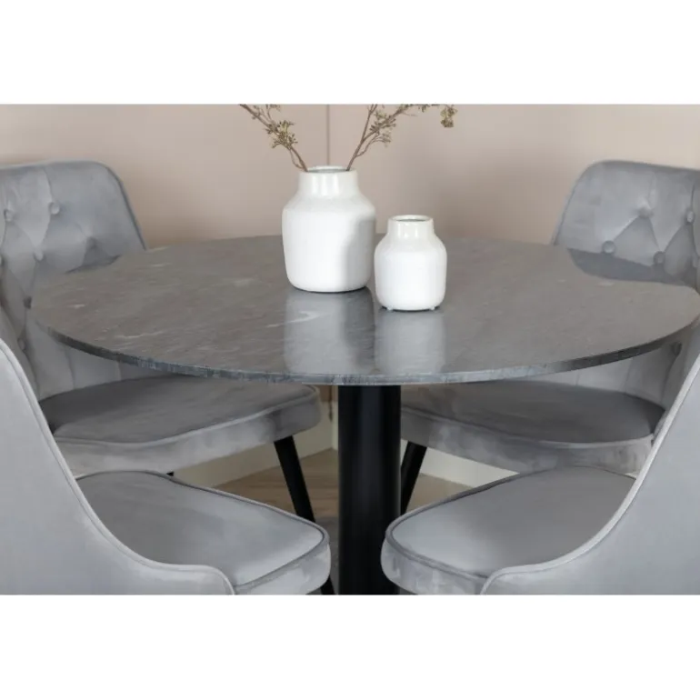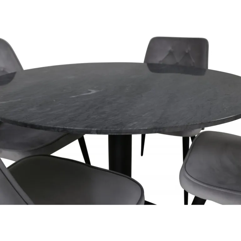 Opgrader din spisestue med det klassiske Estelle Rundt Spisebordssæt. Dette sæt kombinerer en elegant marmorbordplade med stilfulde stole fra Velvet-serien, hvilket skaber en hyggelig og moderne atmosfære i dit hjem. Bordet og stolene er fremstillet af materialer af høj kvalitet som marmor, krydsfiner og stål, hvilket sikrer både holdbarhed og æstetik. Den sorte bordplade og de lysegrå stole passer perfekt ind i enhver indretning. Samling kræves, men med klare instruktioner er det nemt at få dette sæt samlet og klar til brug.
