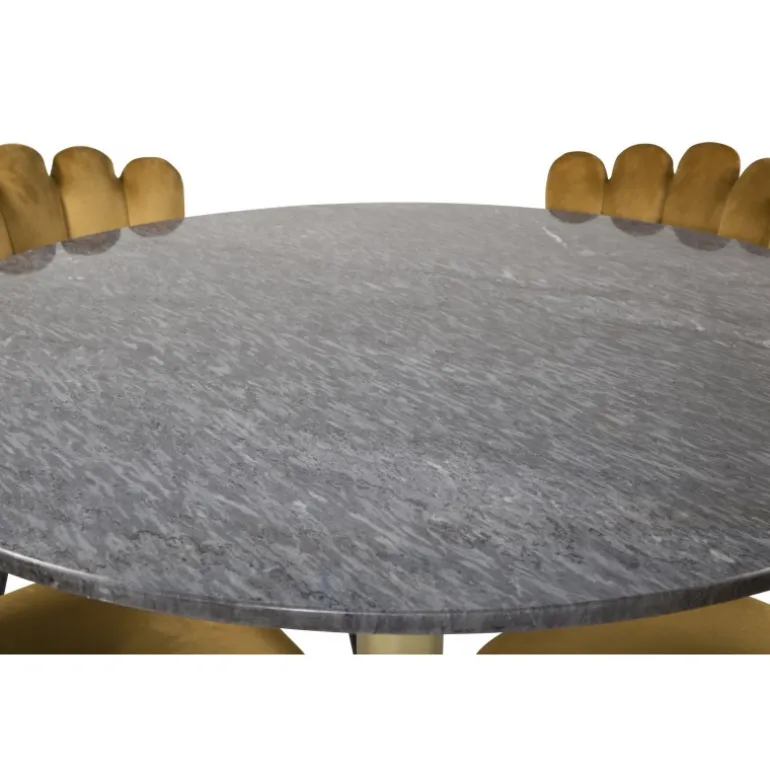 Oplev elegance og komfort med Estelle Rundt Spisebordssæt. Dette moderne marmorspisebord med en robust metalunderstel kombineres perfekt med de bløde gyldne fløjlstole fra Limhamn-serien. Sammen skaber de en luksuriøs og samtidig hyggelig atmosfære i dit hjem. Perfekt til både hverdagsmåltider og festlige lejligheder.