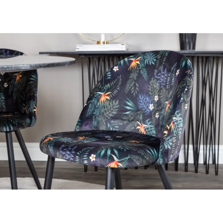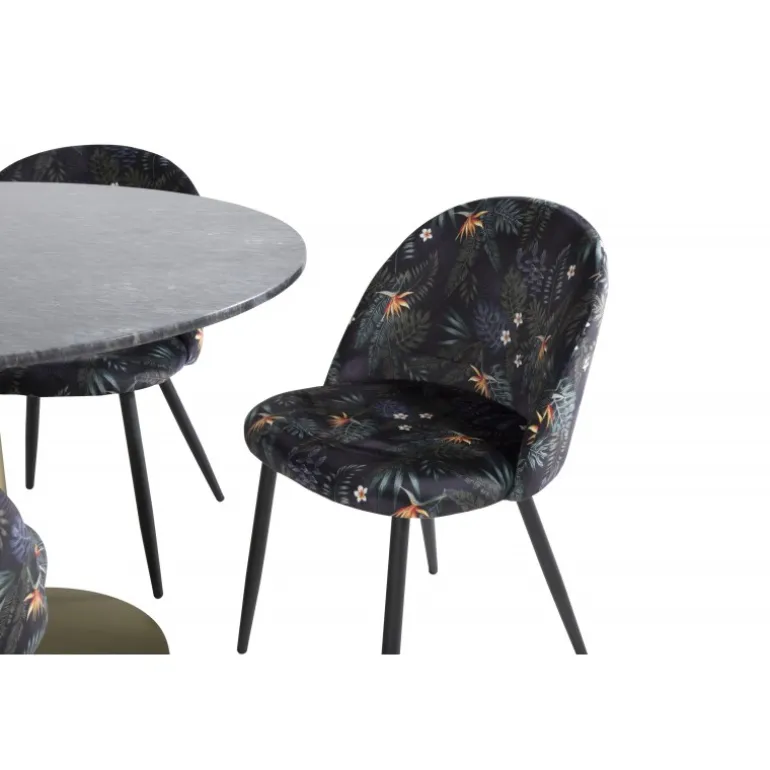 Det elegante spisebord i smuk marmor fra Estelle-serien sammen med komfortable sorte stole med blomstermønster fra Velvet-serien skaber en Spisebordssæt, der er værd at længes efter! Perfekt til moderne hjem, der ønsker en kombination af stil og komfort.
