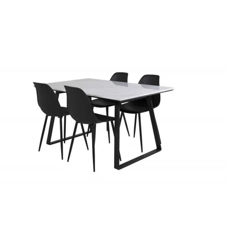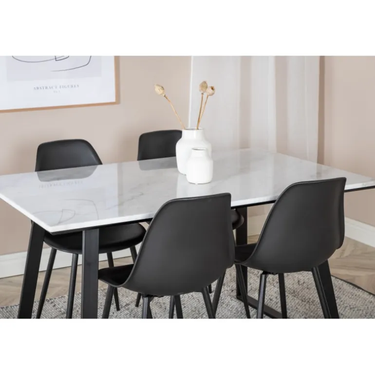 - Moderne design: Stilfuldt spisebordssæt med marmor bordplade og robuste stole.