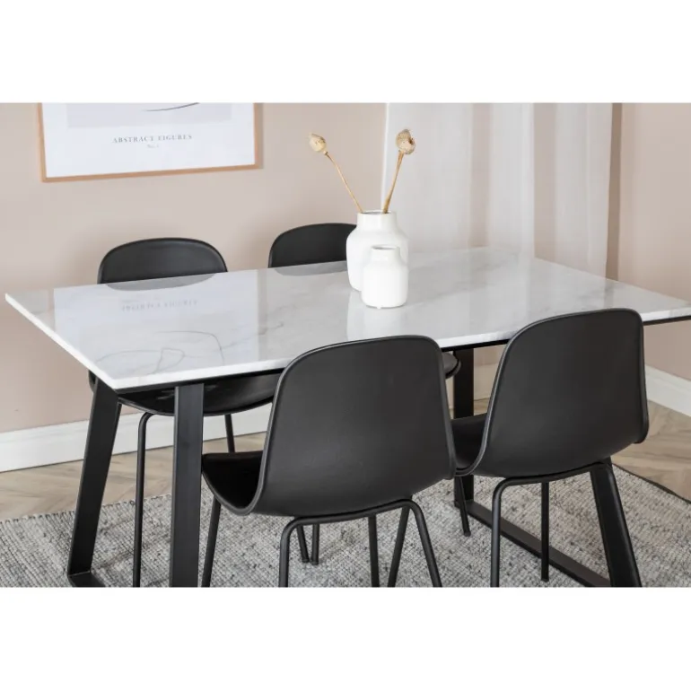 Oplev en madgruppe i moderne og stilfuldt design med Estelle Rektangulær Spisebordssæt. Dette sæt, bestående af Estelle spisebord og Arctic spisestole, er den perfekte kombination til hjemmets hjerte. Det passer sandsynligvis lige så godt til dine behov som til din øvrige indretning. Marmor bordpladen og plastik-stål kombinationen i stolene giver både elegance og holdbarhed.