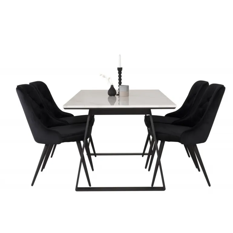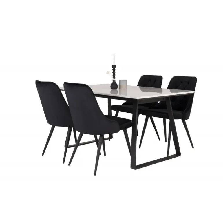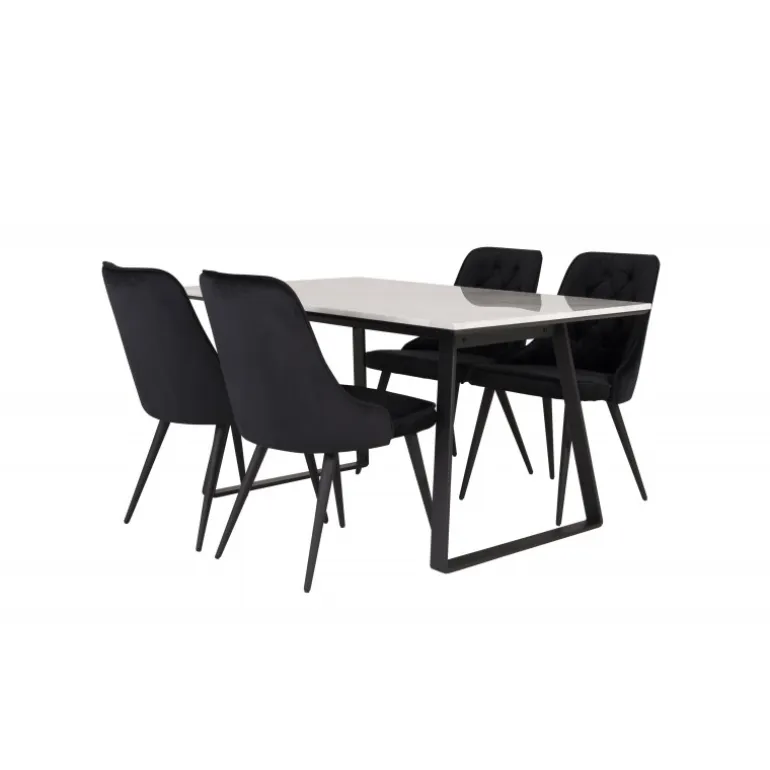 Estelle, et moderne og stilrent spisebord – her sammen med spisebordsstole fra Velvet-serien. Skab noget elegant og socialt med plads til god mad og hyggeligt samvær! Dette smukke sæt er perfekt til enhver spisestue, og dets marblede bordplade og robuste stålkonstruktion giver både stil og holdbarhed. Nem samling kræves for at nyde denne fantastiske spiseoplevelse.