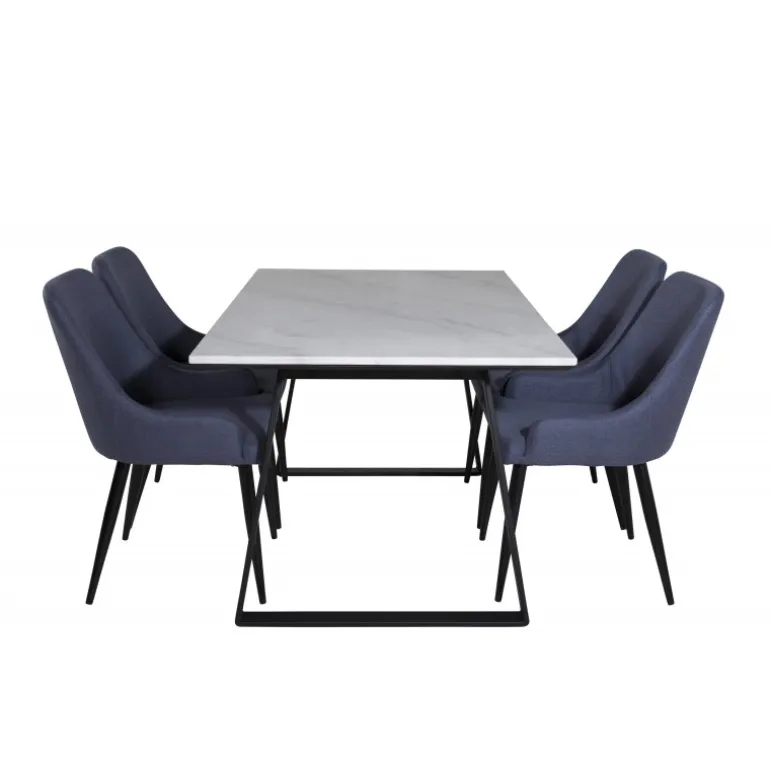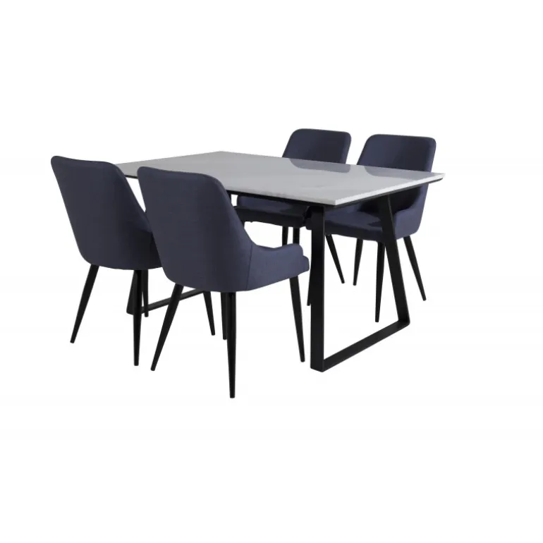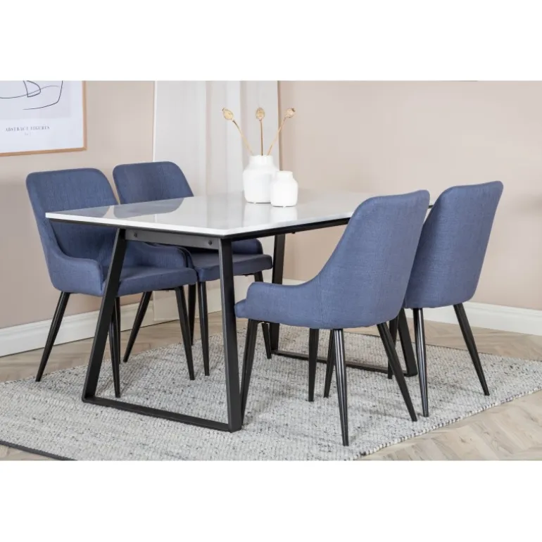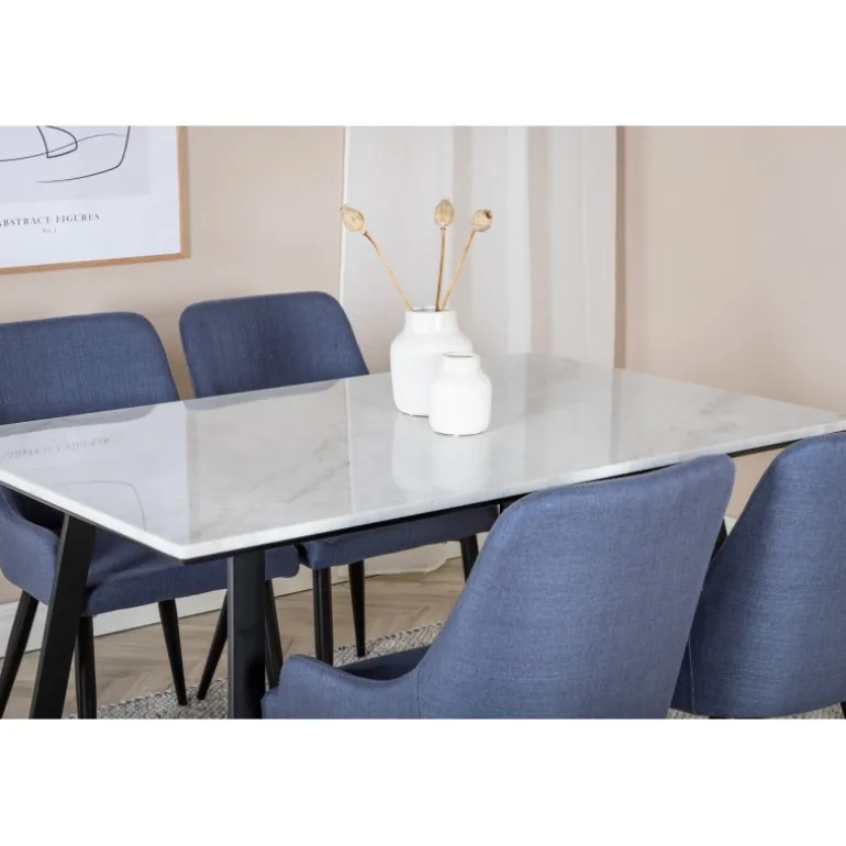 Estelle, et moderne og elegant spisebord – her sammen med spisestole i Plaza-serien. Skab noget stilfuldt og socialt med plads til god mad og hyggeligt samvær! Dette Spisebordssæt er perfekt til både hverdagsmåltider og særlige lejligheder. Bordpladen i marmor giver en luksuriøs følelse, mens stolene i bøgetræ, skum og stål sikrer komfort og holdbarhed. Tilgængeligt i farverne sort, blå og hvid, passer dette sæt ind i enhver moderne indretning.