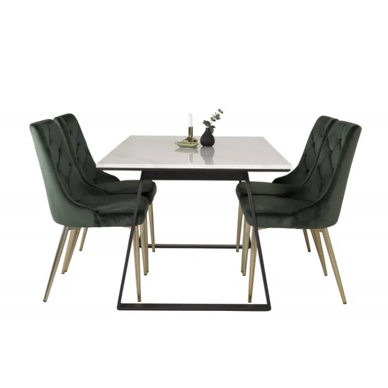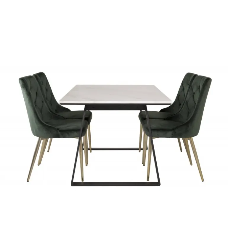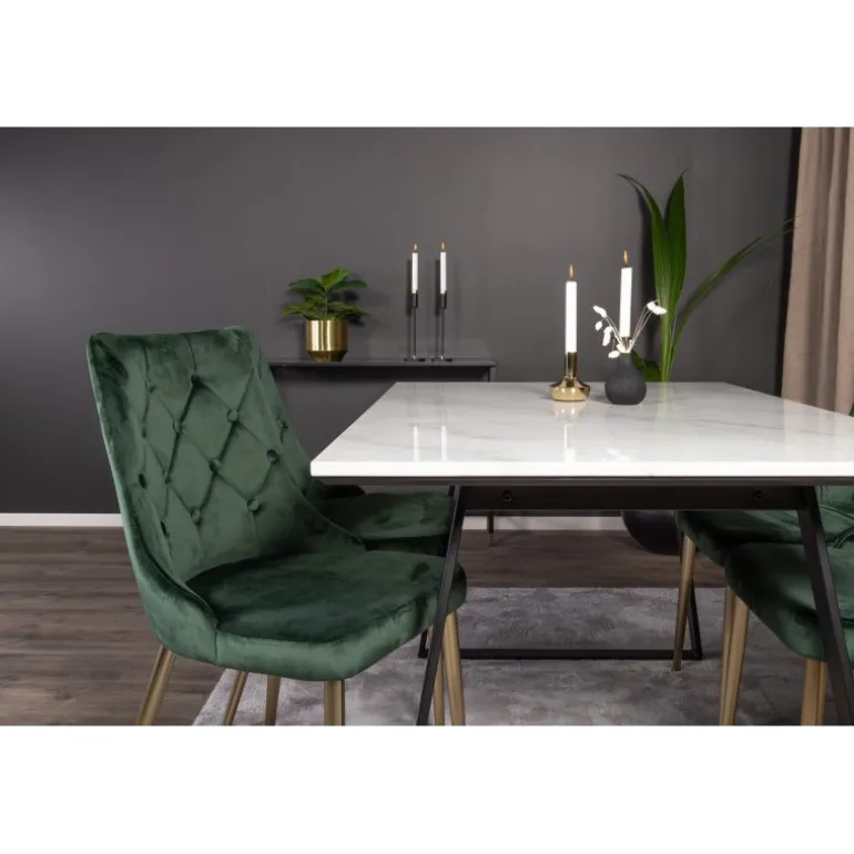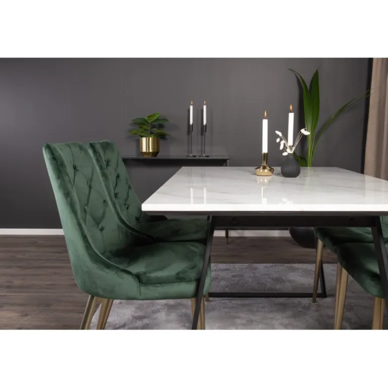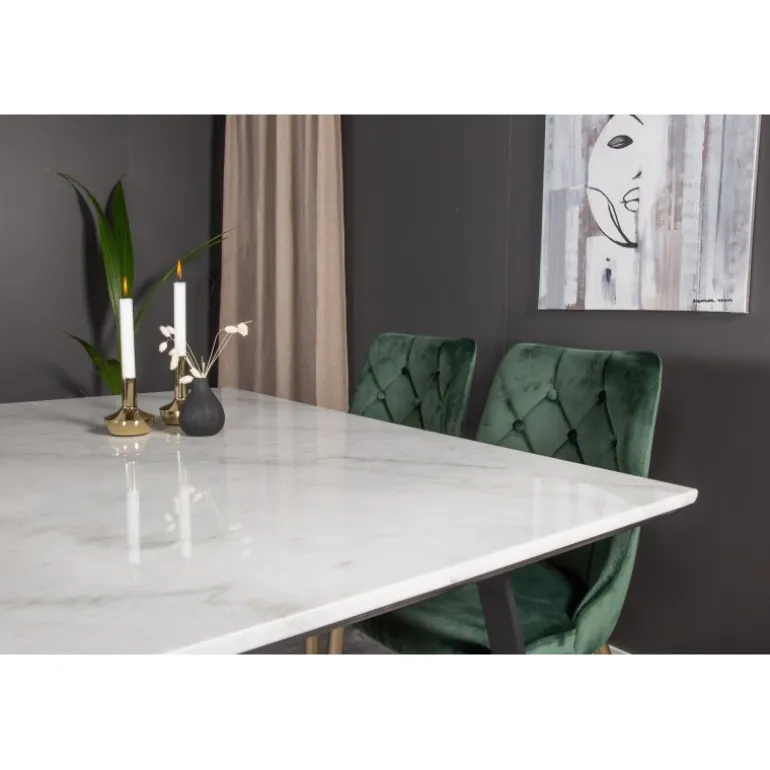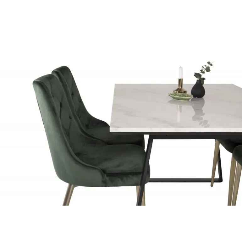 Det elegante marmor spisebord i Estelle-serien kombineres her med de bløde og komfortable stole fra Velvet-serien. Et spisebordssæt, der vil gøre enhver middag til en fornøjelse! Med sin raffinerede hvide bordplade og stilfulde design passer det perfekt ind i ethvert moderne hjem. De polstrede stole giver både komfort og stil, hvilket gør dette sæt ideelt til både hverdagsbrug og særlige lejligheder.