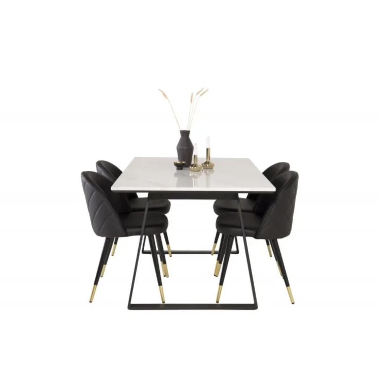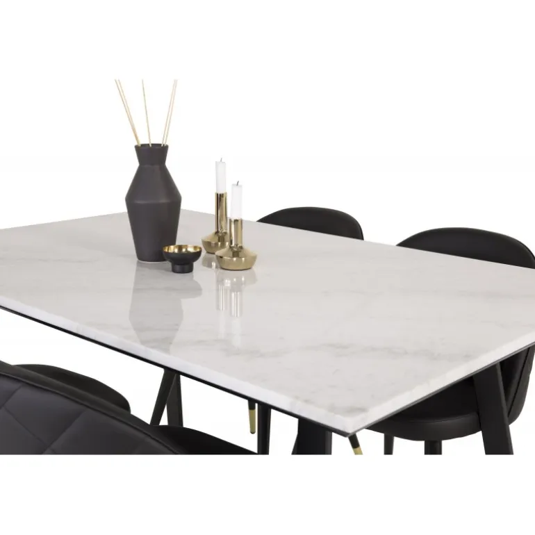 Spisebordet Estelle i et slankt design, sammen med spiseborde Velvet – den perfekte kombination for dem, der ønsker en trendy Spisebordssæt. Stolens høje siddekomfort inviterer til lange og vidunderlige øjeblikke for socialt samvær! Dette elegante Spisebordssæt er ideelt til både formelle middage og afslappede sammenkomster. Bordpladen i marmor tilføjer et luksuriøst touch, mens det robuste stålstel sikrer holdbarhed og stabilitet.