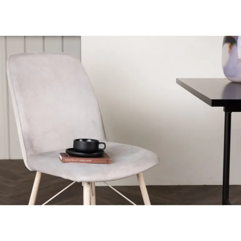 En drømmestol i lyse farver, der bidrager til en stilfuld og frisk atmosfære i dit hjem! EVERYDAY spisebordsstol har et fuldt polstret sæde i lysegrå velourstof, der giver en let og skinnende glans til øjet. Stolens ben er cylindriske og let udfladede i hvidvasket træ. Den perfekte spisebordsstol til det moderne hjem!