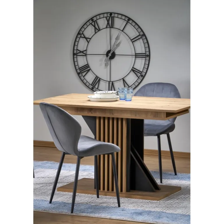 Oplev FABIANO Spisebord med udtræk i artisan eg og Sort, perfekt til at opgradere dit spisestueinteriør. Dette bord er lavet af lamineret spånplade, hvilket sikrer langvarig holdbarhed og let vedligeholdelse. Med dimensionerne 130-175/85/76 cm kan det nemt justeres for at passe til både små og store sammenkomster. Bordets top er i elegant wotan eg, mens benene kombinerer wotan eg og Sort for et moderne udseende. Hvert bord leveres i én kasse med en netto vægt på 49.500 kg og en brutto vægt på 50.000 kg.
