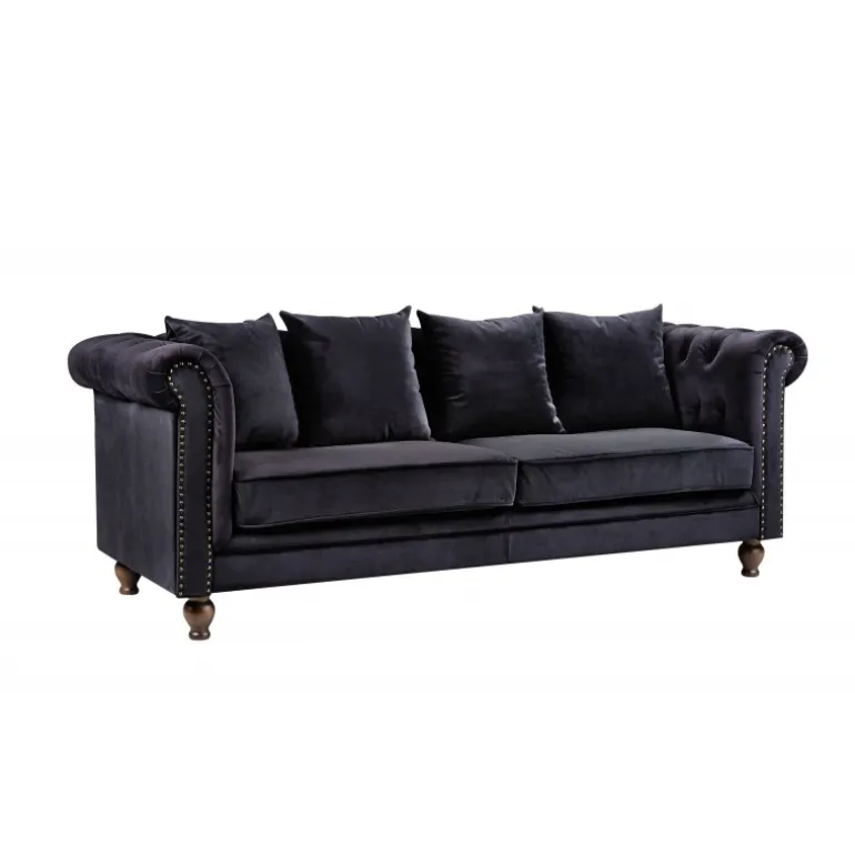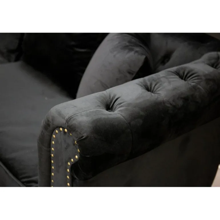 Sæt tonen med denne sofa og lad dit hjem blive dekoreret af et håndværk med tradition! Den klassiske Chesterfield sofa er rustik og luksuriøs i sit udtryk med meget karakteristiske detaljer. Fløjl er en stilfuld sofaserie i Chesterfield design med lækkert fløjlsstof og dekorative dybe-knapper. Denne rummelige og komfortable 3 personers sofa med lige design og pompøs sort polstring giver en kunstnerisk og smuk følelse til dit hjem. De rustikke træsofabener bidrager til sofaens elegante design og moderne look. Plejeråd: Fløjl har en tendens til at få trykmærker, når luv ligger ned. Trykmærkerne kan få stoffet til at se slidt ud, hvilket er helt normalt for denne type materiale. Afhængigt af hvordan lyset falder, kan stoffet ændre sig i de mest forskellige nuancer.