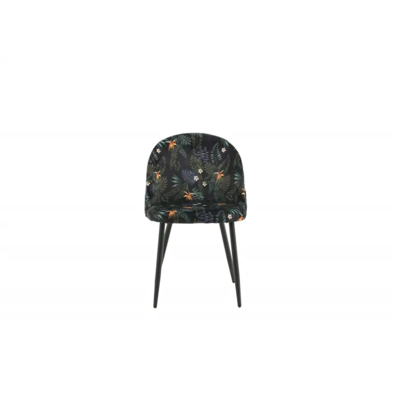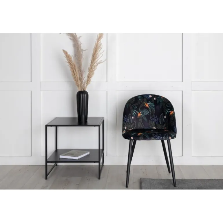 Skab et blikfang, der skiller sig ud med flerfarvede spisebordsstole fra Fløjls-serien! Denne spisebordsstol har en ramme og ben i sort pulverlakeret metal og et stilfuldt design med en rund ryg. Ryg og sæde er polstret med sort blomsterprintet polyesterstof, der skaber et personligt præg i indretningen. Lettere samling er påkrævet. Plejeanvisning: Fjern pletter med det samme, gnid ikke, men forsøg at suge op forsigtigt med en klud. Hvis pletterne ikke går væk, prøv en pletfjerner, som du først tester på en mindre synlig del af stoffet. Vi anbefaler, at større møbler skummes mindst tre gange om året.