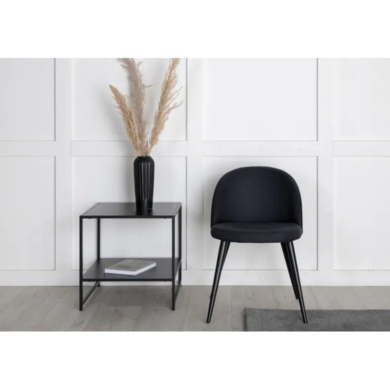 Stilfuld, praktisk og holdbar spisebordsstol i en konsekvent sort farve – lige så godt udseende som tidløs simpel! Denne stol fra Fløjls serien har et fuldt beklædt design, ben i sort pulverlakeret metal og afrundet ryg og sæde i sort polyesterstof. Ryg og sæde med blød polstring for ekstra komfort. Lettere samling er påkrævet. Lad tiden ved spisebordet blive en af dagens højdepunkter! Plejeråd: Brug tekstilspray til at imprægnere tekstilet, før du begynder at bruge det, det vil også gøre snavs og pletter lettere at fjerne i fremtiden. Fjern pletter med det samme, gnid ikke men forsøg at suge forsigtigt op med en klud.