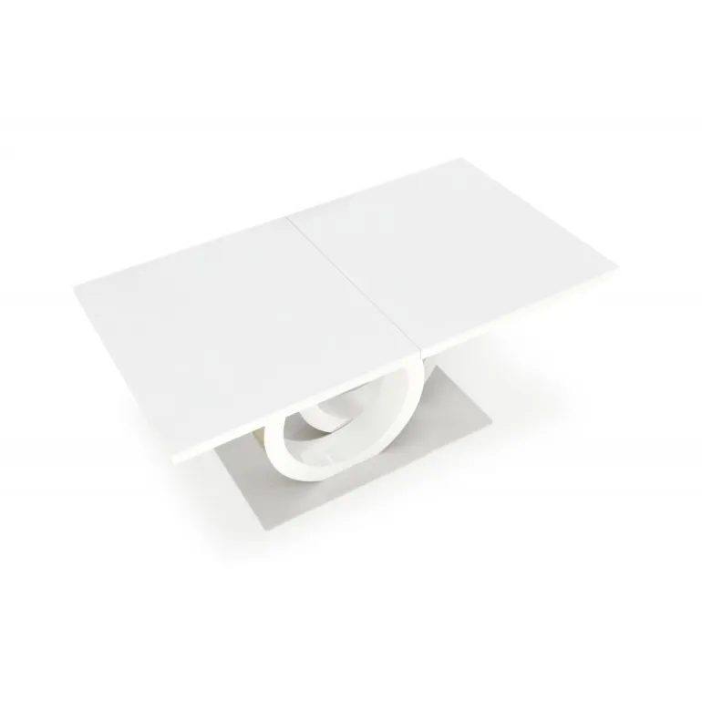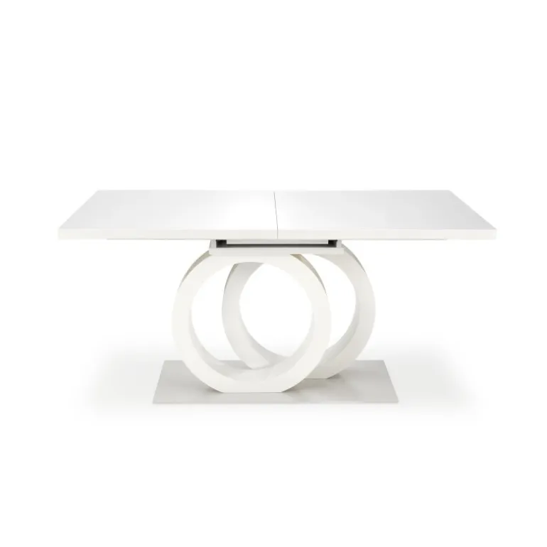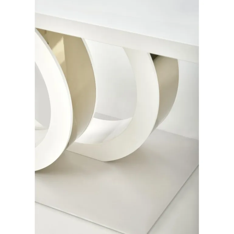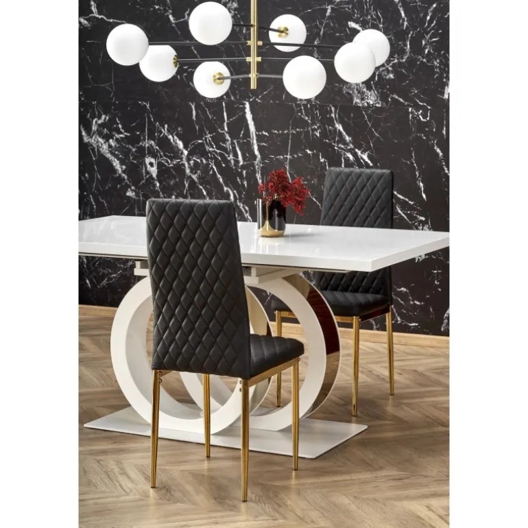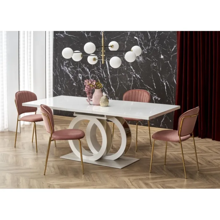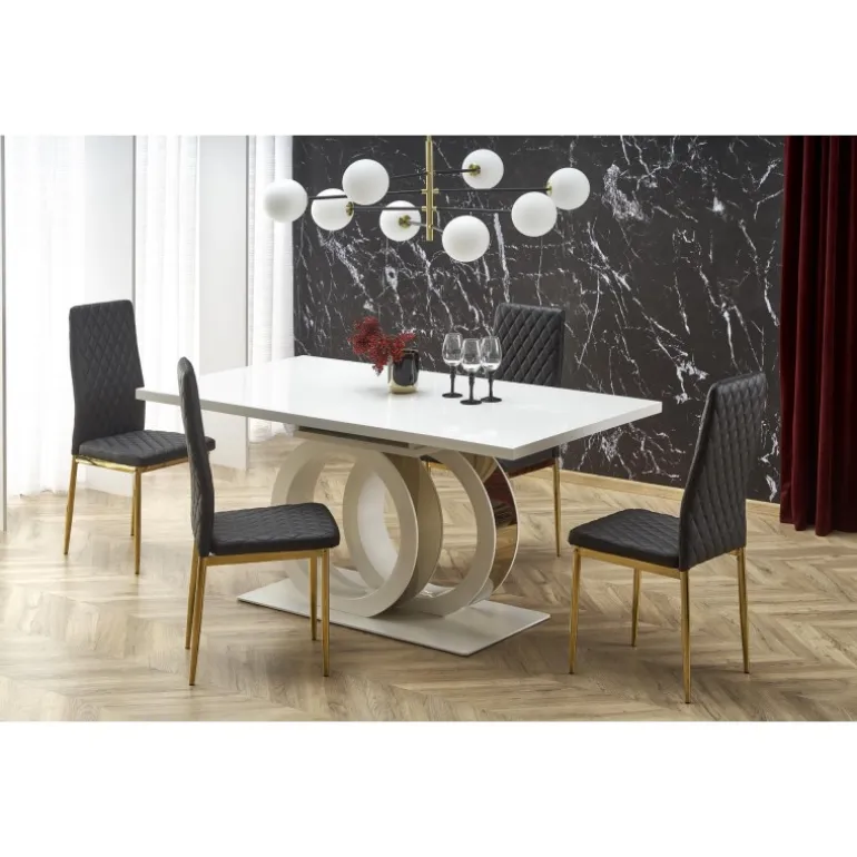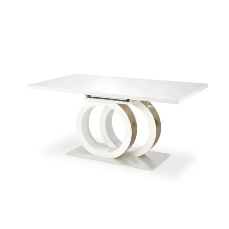 Opgrader dit hjem med det elegante GALARDO Spisebord med udtræk i hvid og guld. Med dimensionerne 160-200/90/76 cm er dette bord perfekt til både små sammenkomster og større middage. Spisebord med udtræket er fremstillet af lakeret MDF finer og rustfrit stål, som sikrer både holdbarhed og stil. Den pulverlakerede stålramme giver ekstra stabilitet, mens den sofistikerede farvekombination af hvid og guld tilføjer et luksuriøst touch til dit interiør.