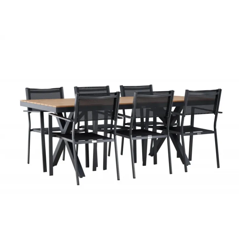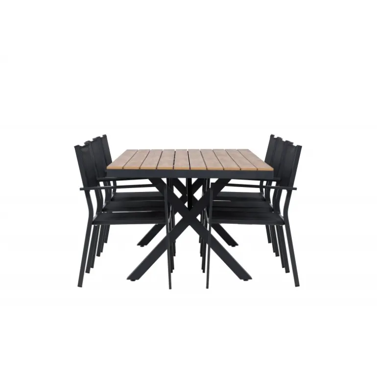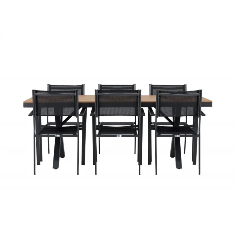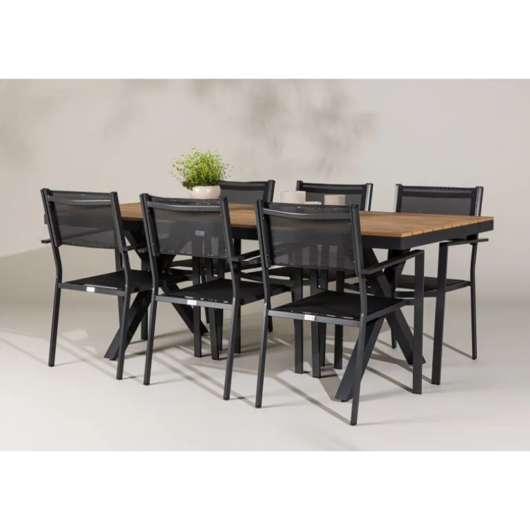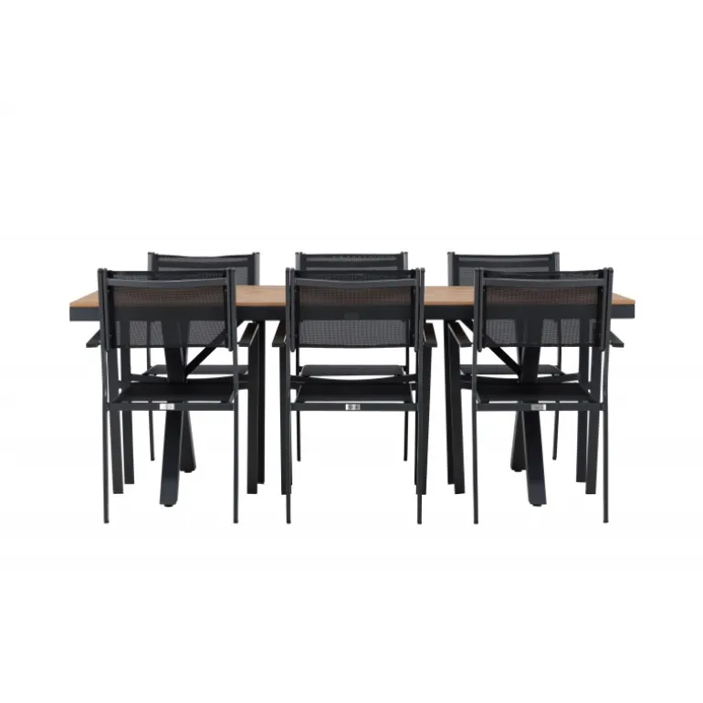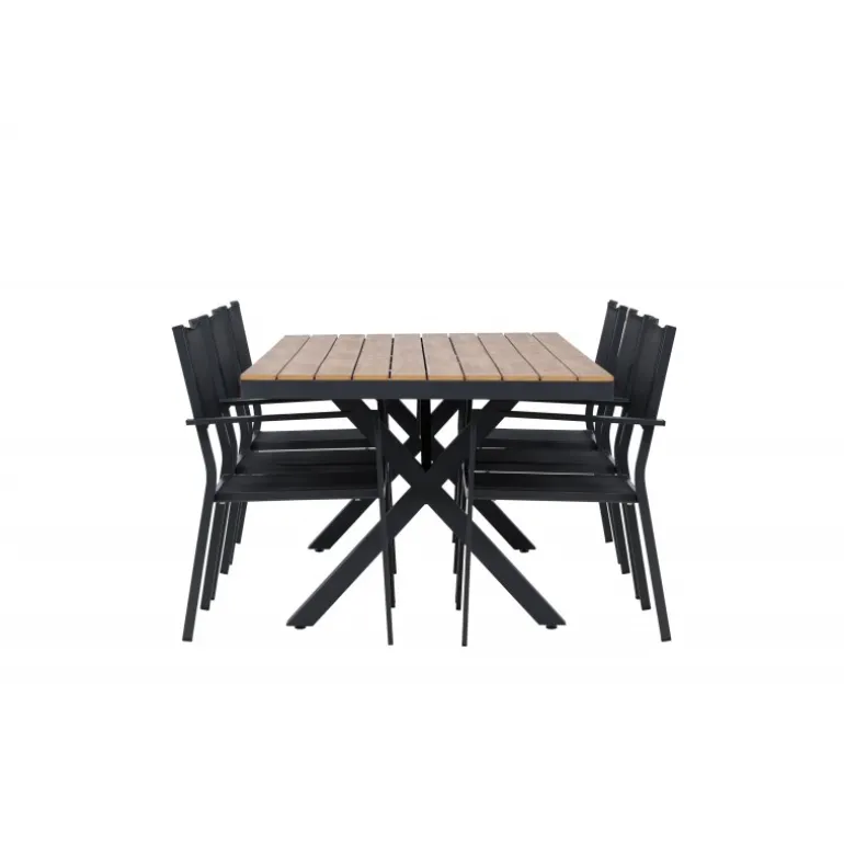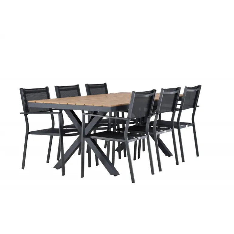 Oplev det perfekte Loungesæt – Havemøbelsæt til din udendørs plads med vores elegante ensemble bestående af Garcia-bordet og Copacabana-stolene. Garcia-bordet er midtpunktet i din udendørs spiseoplevelse med generøse dimensioner på 100×200 centimeter. Fremstillet af aluminium i en smuk brun nuance, udstråler dette bord stil, der sømløst smelter ind i dit udendørs miljø. Copacabana-stolene er det ultimative supplement til Garcia-bordet. Fremstillet af aluminium i en elegant sort farve, tilbyder disse stole både stil og komfort til din udendørs afslapning. Med seks medfølgende stole er dette Loungesæt – Havemøbelsæt perfekt til at samle familie og venner til mindeværdige øjeblikke under åben himmel. Giv din udendørs plads den perfekte atmosfære til spisning og afslapning med vores Garcia og Copacabana Loungesæt – Havemøbelsæt.