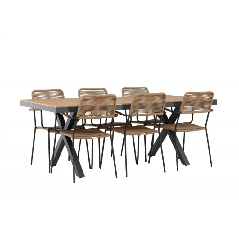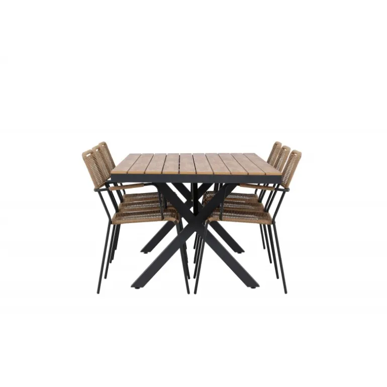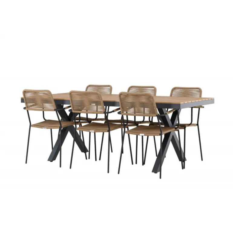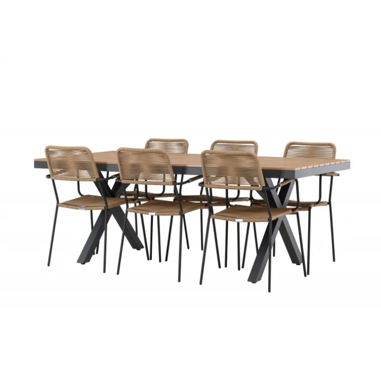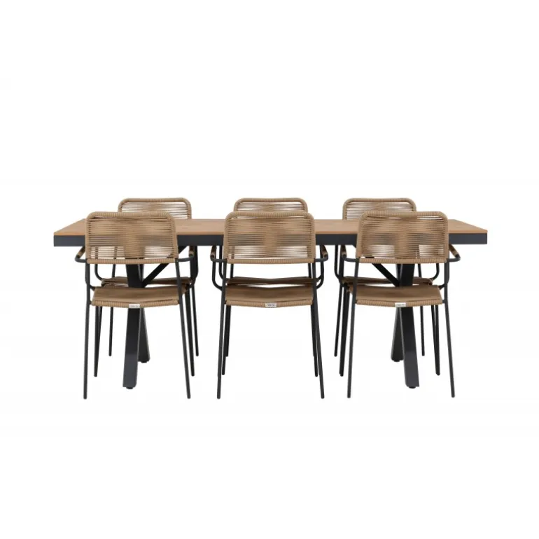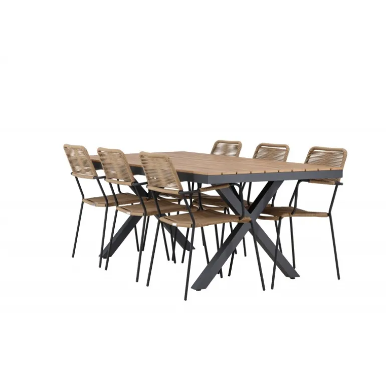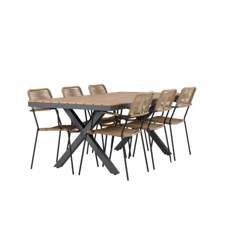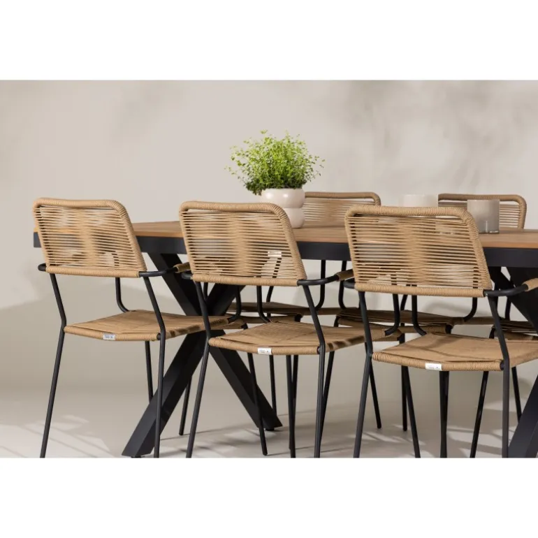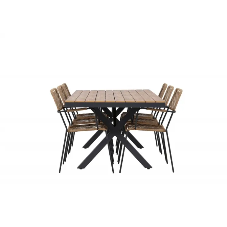 Oplev det perfekte Loungesæt – Havemøbelsæt til din udendørs omgivelser med vores elegante ensemble, bestående af Garcia bordet og Lindos stolene. Garcia bordet fungerer som midtpunktet for dine udendørs måltider, generøst dimensioneret til 100×200 centimeter. Lavet af aluminium i en smuk brun nuance, udstråler dette bord en stil, der sømløst blander sig i din udendørs indretning. Lindos stolene er den ultimative komplement til Garcia bordet. Fremstillet med reb og stålben i en harmonisk brun farve, tilbyder disse stole både stil og komfort til din udendørs afslapning. Med seks stole inkluderet er dette Loungesæt – Havemøbelsæt perfekt til at samle familie og venner til mindeværdige øjeblikke under åben himmel. Giv din udendørs plads den perfekte atmosfære til spisning og afslapning med vores Garcia og Lindos Loungesæt – Havemøbelsæt.
