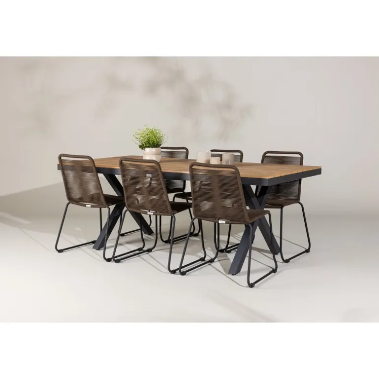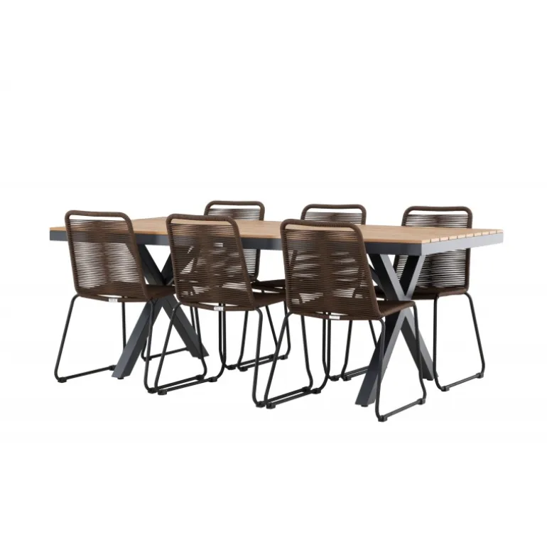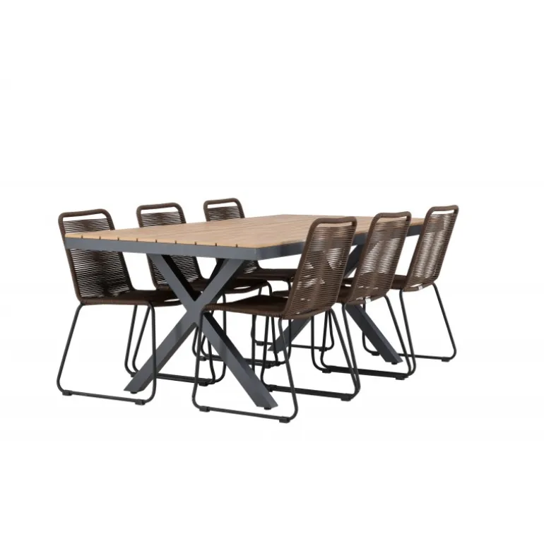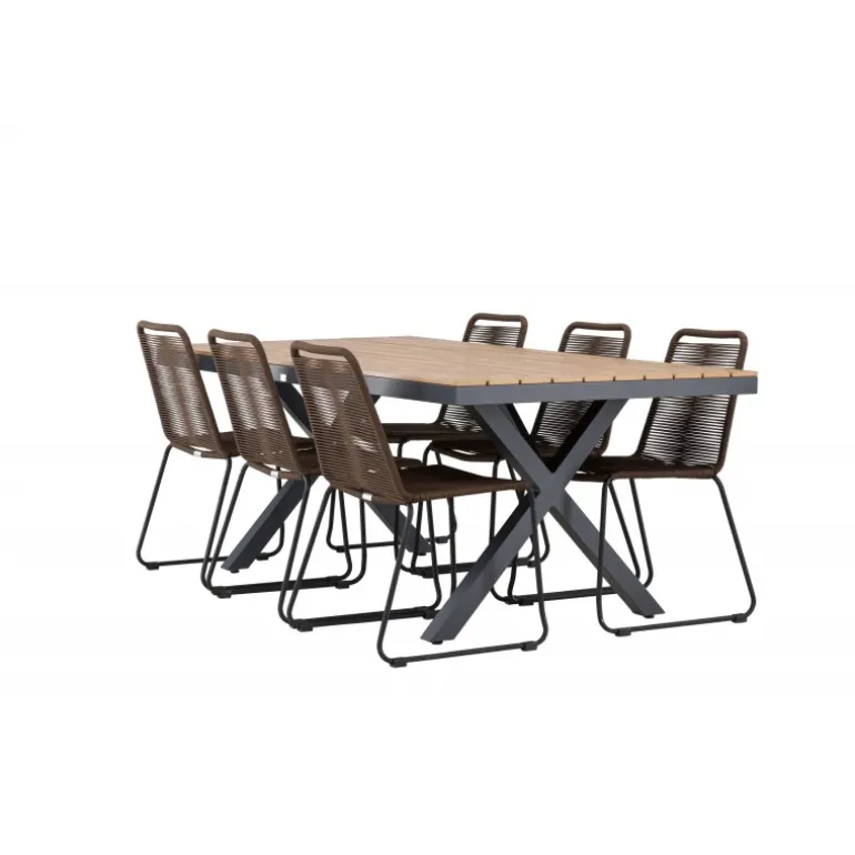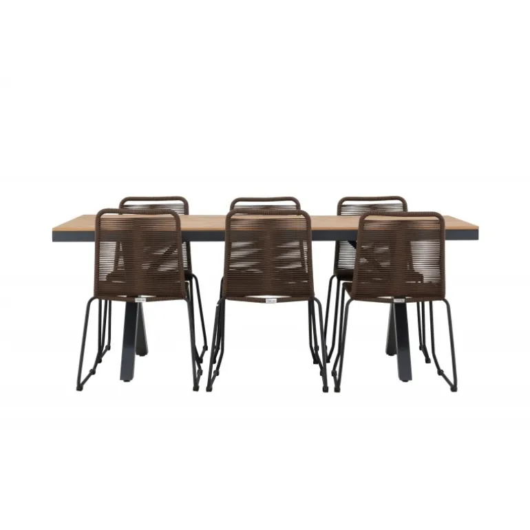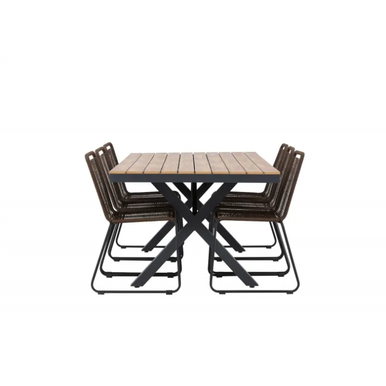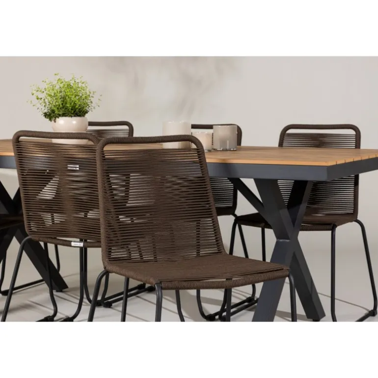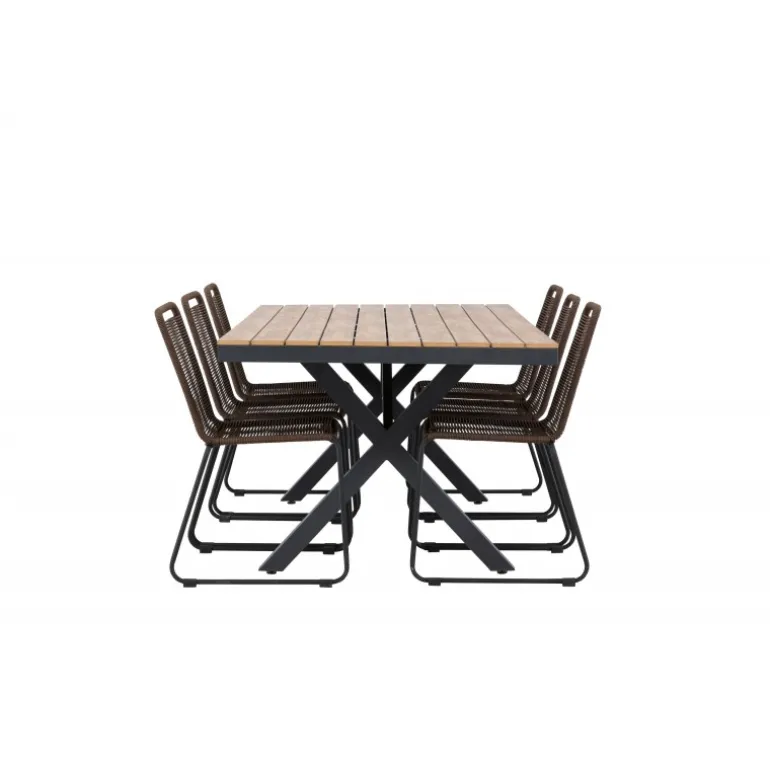 Oplev det perfekte samlingspunkt for venner og familie med vores nye Loungesæt – Havemøbelsæt – Lindos og Garcia. Med gennemtænkt design og en jordnær følelse vil dette ensemble skabe en varm atmosfære og løfte dit udendørsområde til nye højder. Lindos-stolene er lavet med omhu og design i tankerne. De har sæder i brunt polypropylenmateriale og ben i sort stål, som tilbyder både komfort og stil. Denne kombination tilføjer et moderne touch med en varm og indbydende følelse. Garcia-bordet fungerer som midtpunkt i dette Loungesæt – Havemøbelsæt med sine imponerende dimensioner på 200×74 cm. Bordpladen i brunt finer materiale og basen i sort aluminium giver et gennemtænkt og slankt look, der er perfekt til samlinger med kære udendørs. Dette Loungesæt – Havemøbelsæt er ideelt til udendørs brug og skaber en atmosfære af kammeratskab og venskab med sit varme og jordnære design. Med seks stole inkluderet er dette sæt komplet til at skabe mindeværdige øjeblikke og nyde dejlige udendørs oplevelser.