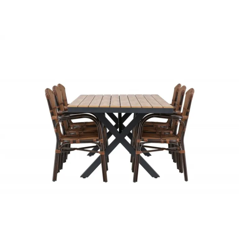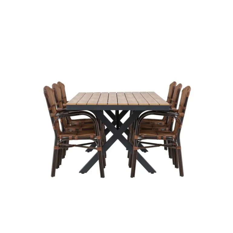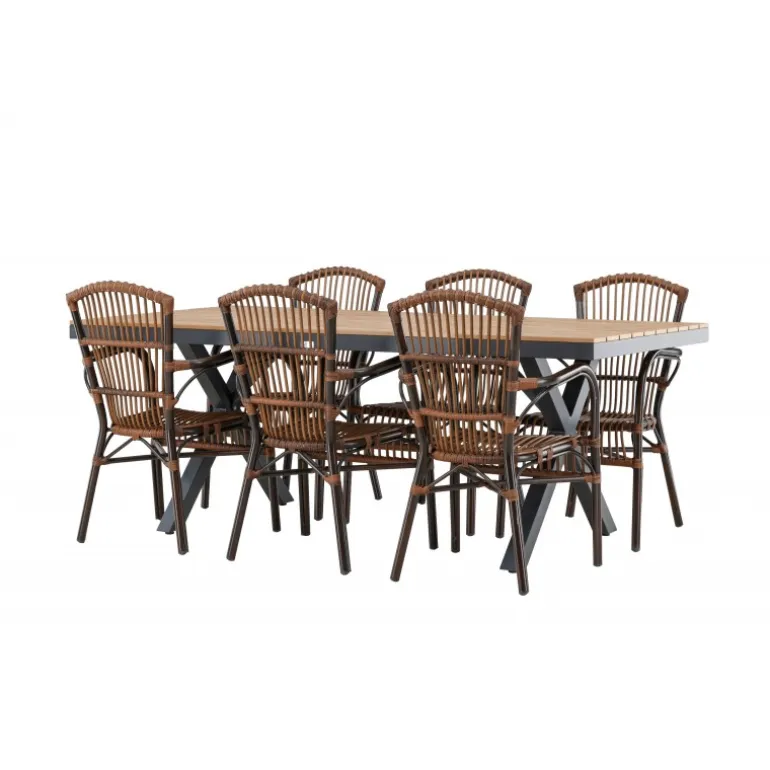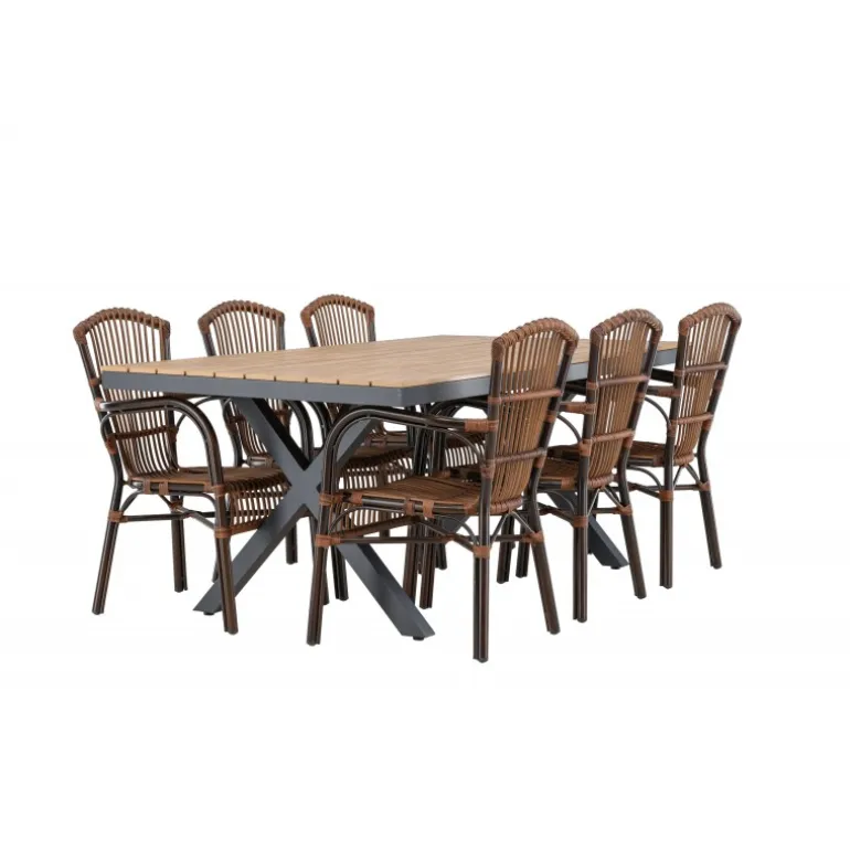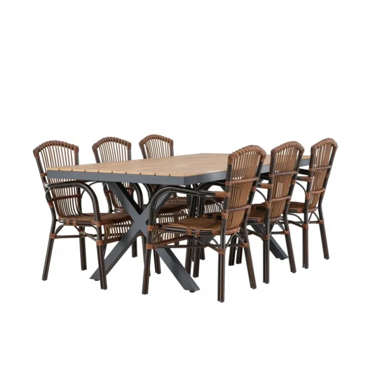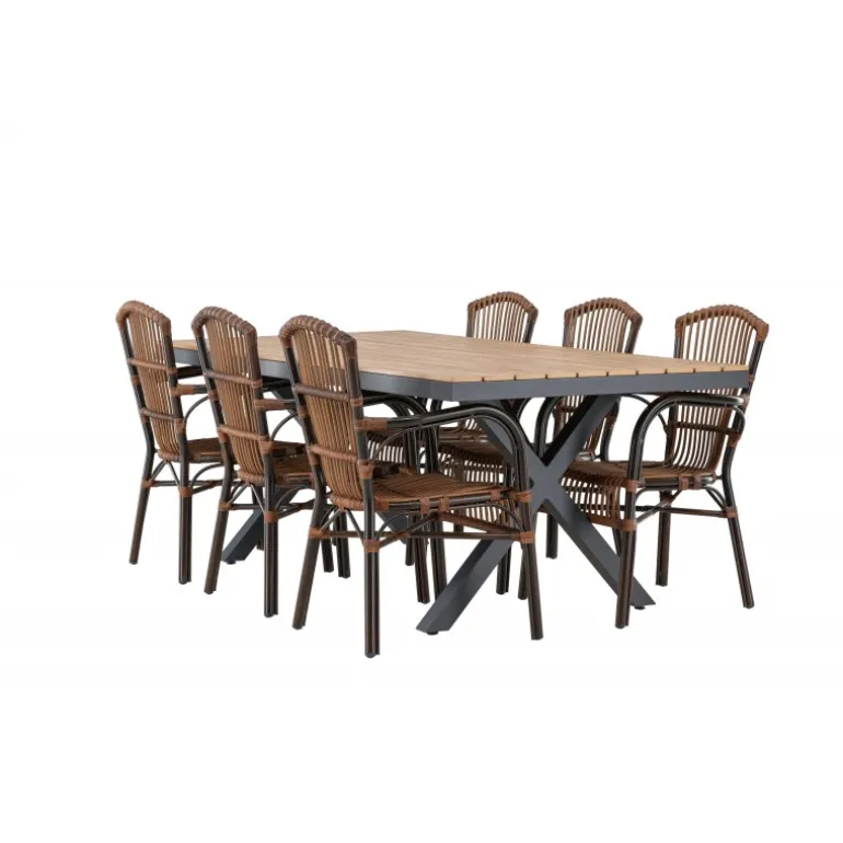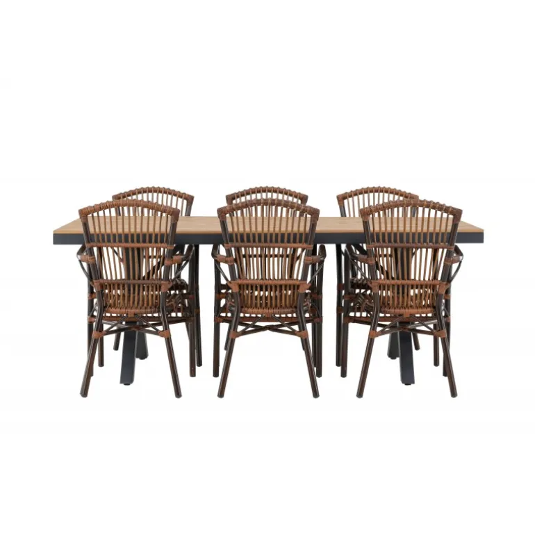 Oplev det perfekte sted for at samles med venner og familie med vores nye Loungesæt – Havemøbelsæt – Galera og Garcia. Med en atmosfære af venskab og fællesskab løfter dette ensemble dit udendørsmiljø til nye højder. Galera-stolene er designet til at kombinere stil og komfort sømløst. Deres brune rattan-sæder giver et rustikt præg, mens aluminiumsbenene giver stabilitet. Disse stole er skabt til at være både trendy og komfortable, ideelle til længere udendørs sammenkomster. Garcia-bordet er midtpunktet i dette Loungesæt – Havemøbelsæt med sine generøse dimensioner på 200×74 cm. Med en bordplade i brun finer og en base i sort aluminium tilbyder det et moderne og trendy design, der passer perfekt ind i nutidens udendørsmiljøer. Dette Loungesæt – Havemøbelsæt er perfekt til udendørs brug og bringer en trendy og moderne atmosfære til din have eller terrasse. Med seks stole inkluderet er dette sæt komplet til at skabe mindeværdige øjeblikke og nyde selskabet udendørs.