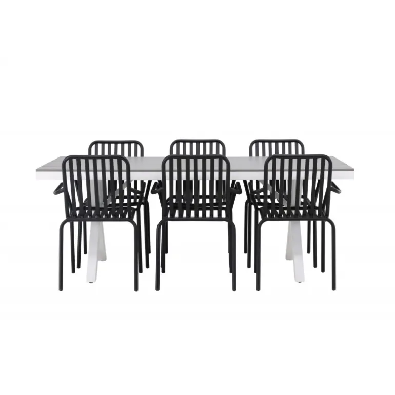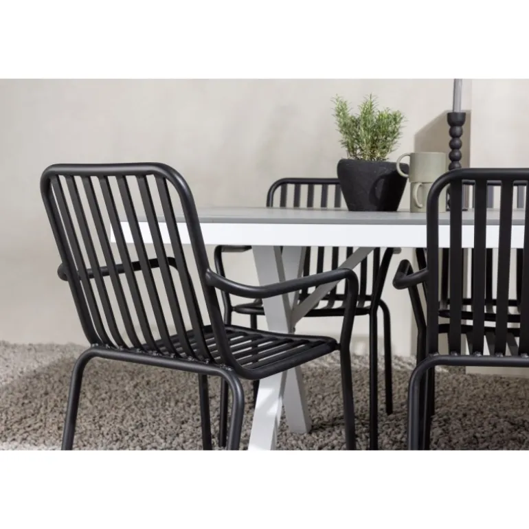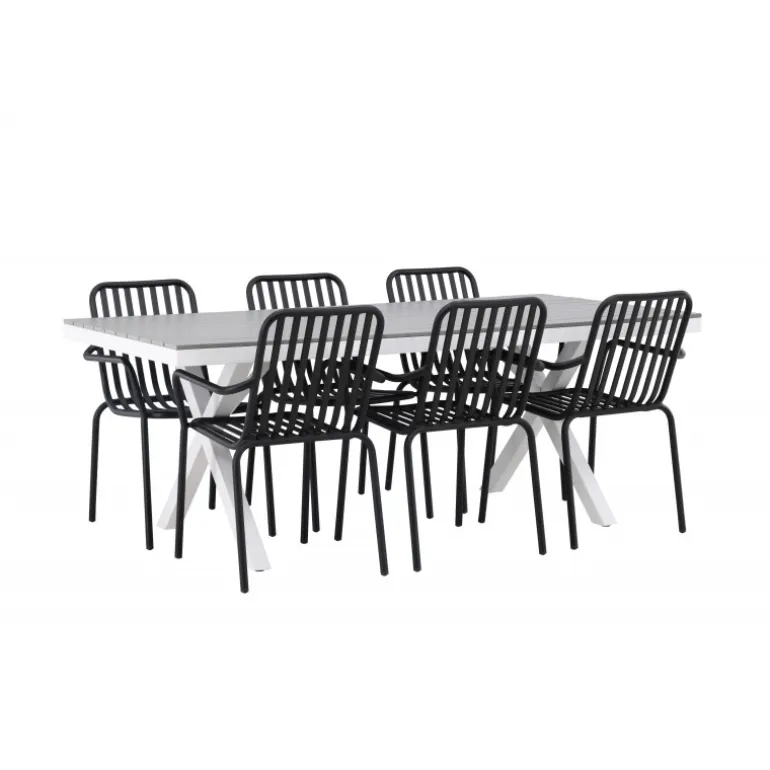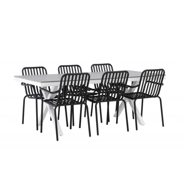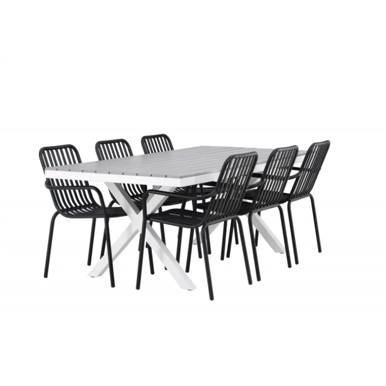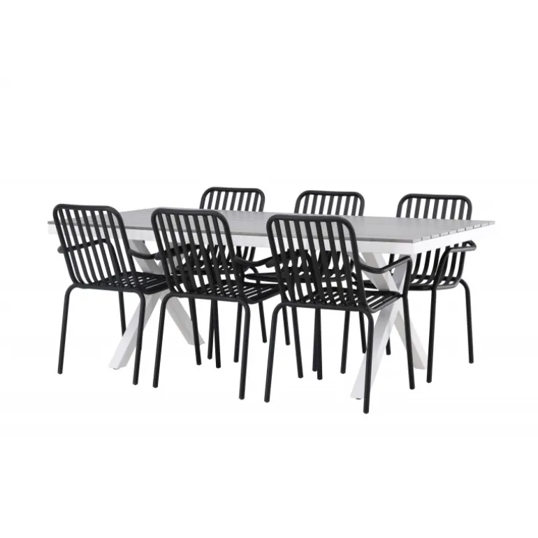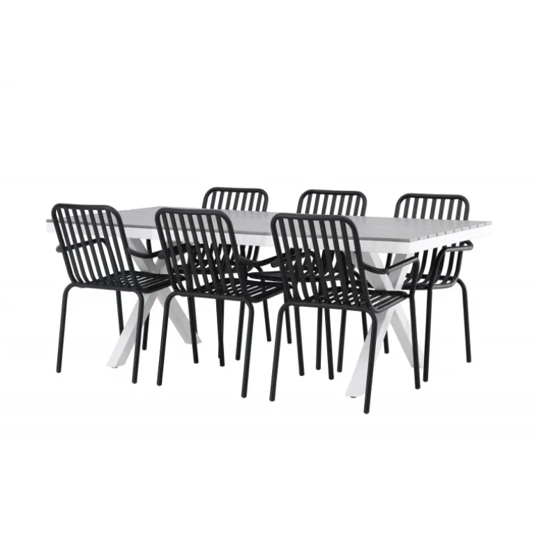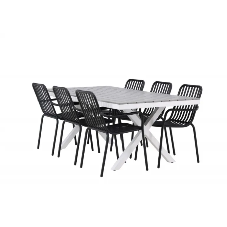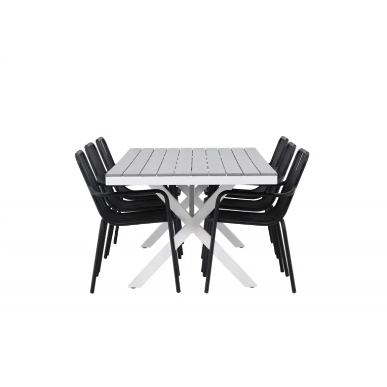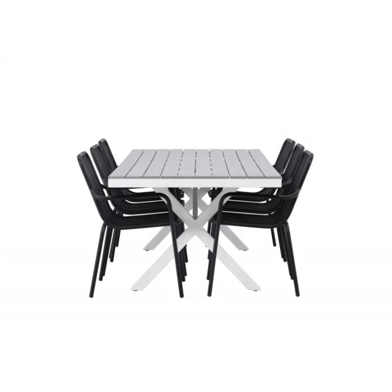 Et Loungesæt – Havemøbelsæt som virkelig er en øjefanger! Vores rektangulære spisebord Garcia har et klassisk design med en bordplade i smagfuld aintwood og krydsede bordben i hvidt aluminium. Her sammen med vores dejlige spisebordsstole fra Beijing-serien. Stolens ribbede design og sodfarvede sorte farve gør den både moderne og tidløs. Fremstillet af aluminium, hvilket gør den let at flytte rundt og har integrerede armlæn for ekstra komfort. Her kan du sidde i flere timer og nyde din terrasse! Bordets mål: 200x100cm.