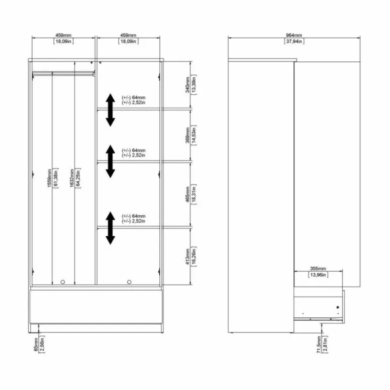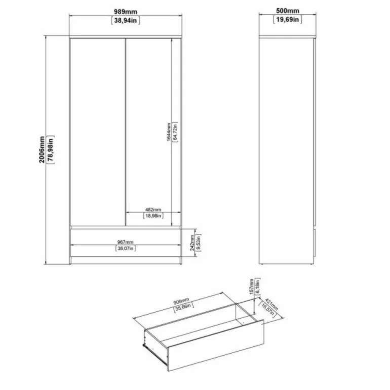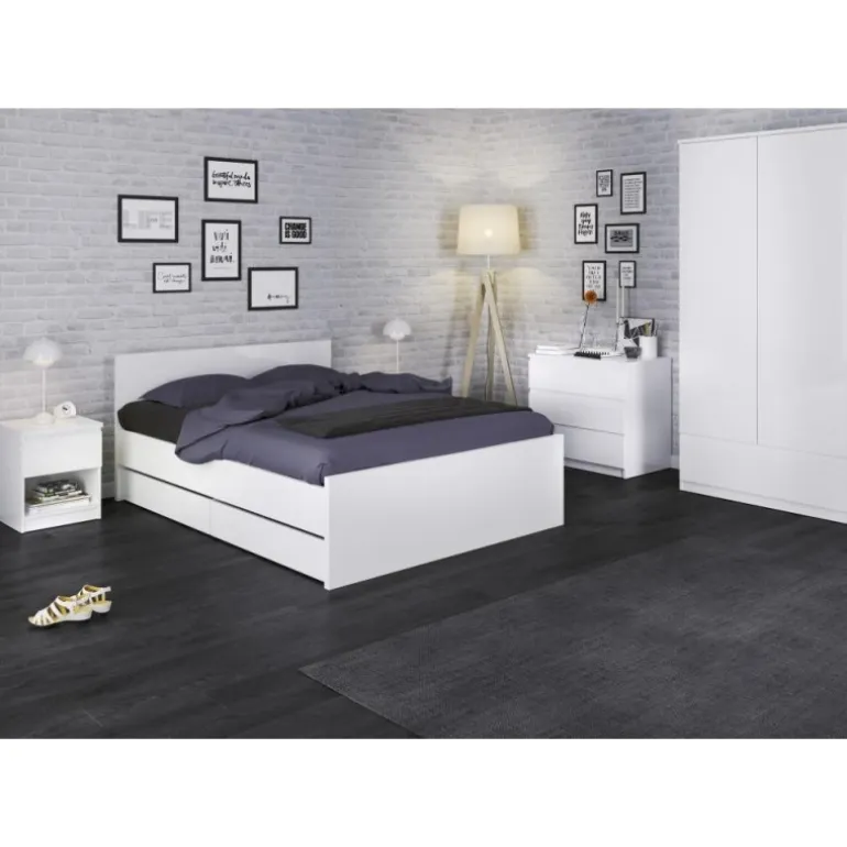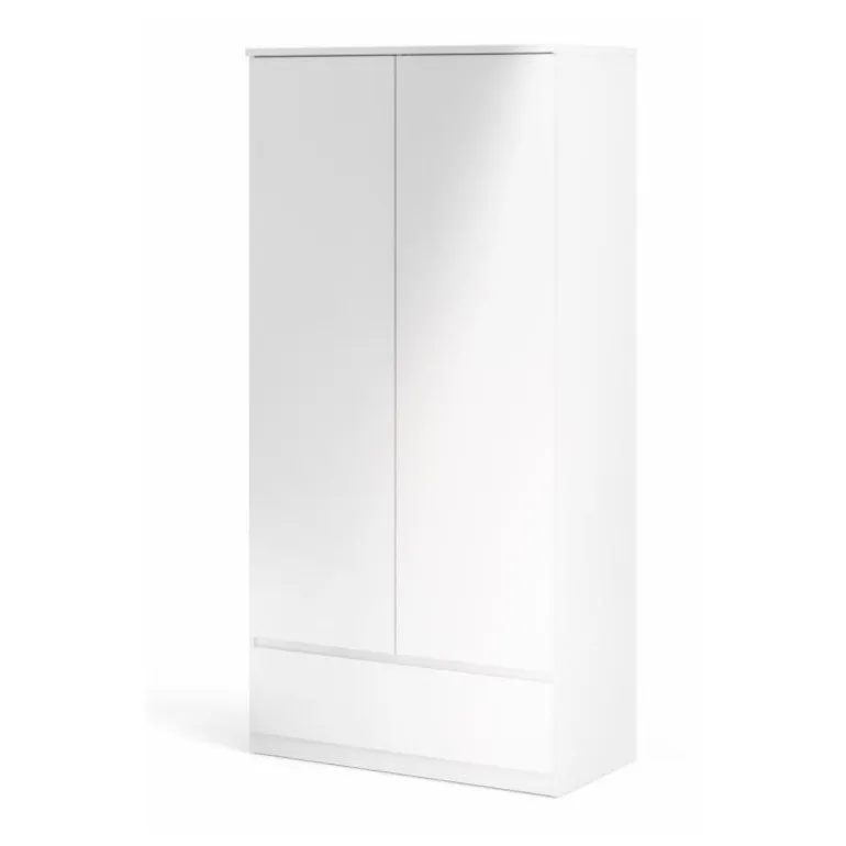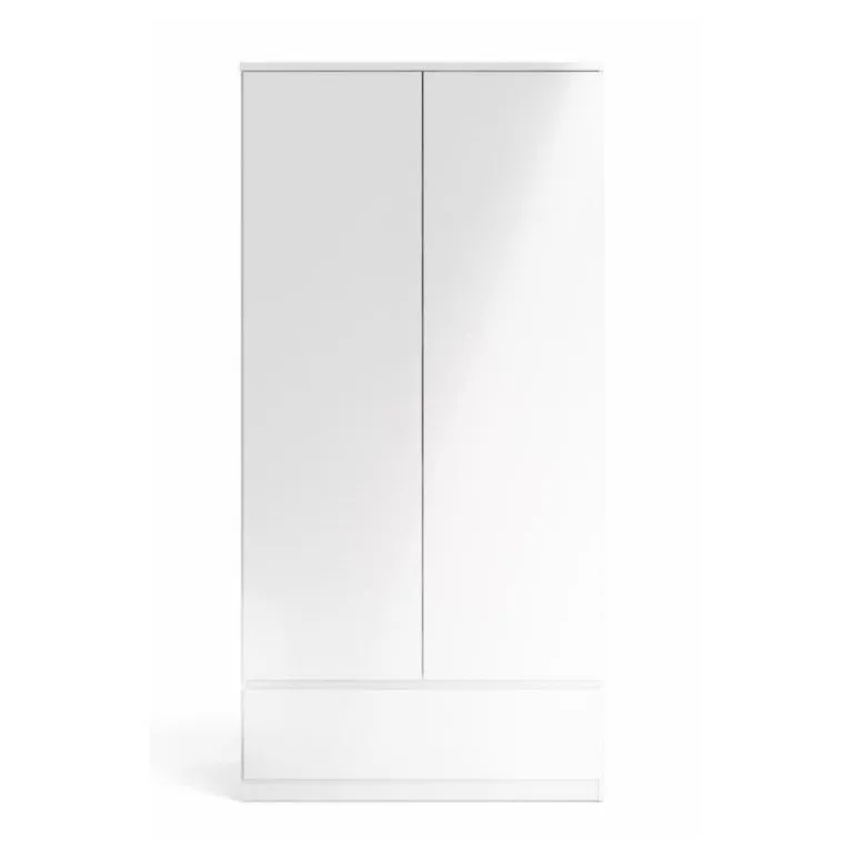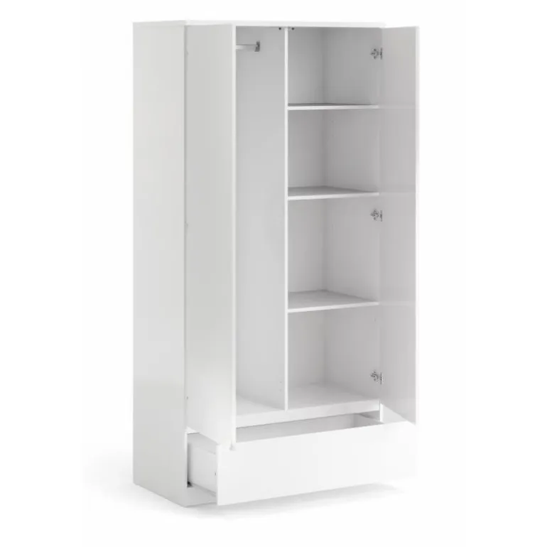 Rummeligt klædeskab i hvid højglans med 2 fløje og 1 skuffe i bunden. Skabet bliver yderst praktisk til opbevaring med sin store skuffe i bunden, og der er god plads til alt dit tøj med dette høje skab.