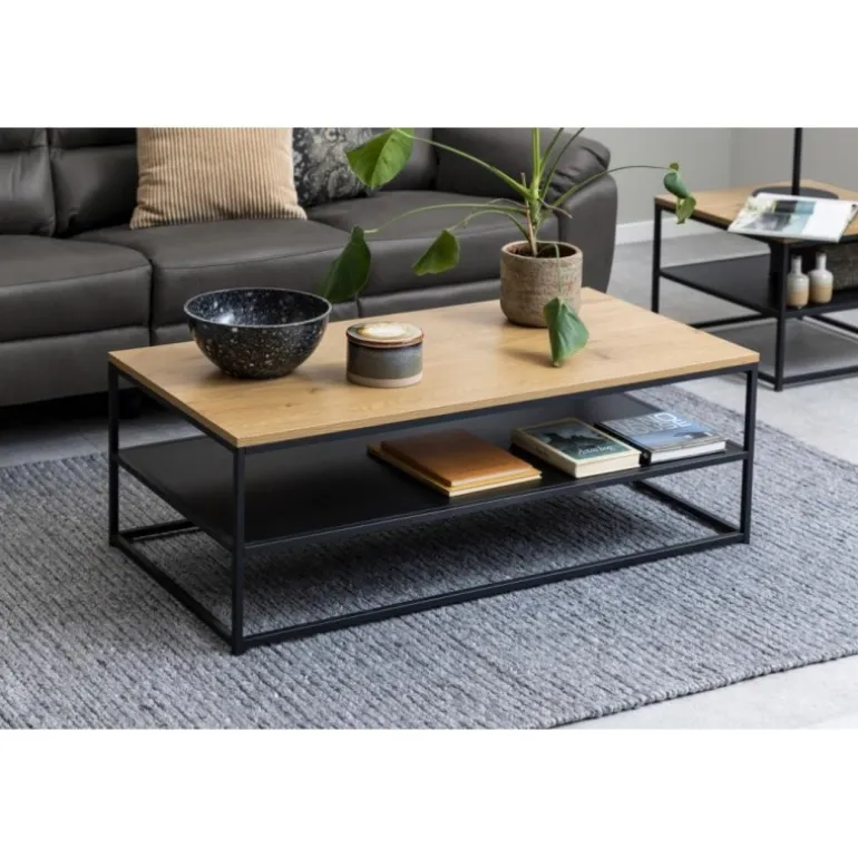 Gila sofabord bordplade melamin mat vild eg, hylder melamin sort, 1 stk, stel metal pulverlakeret ru mat sort L:120 B:60 H:42 cm