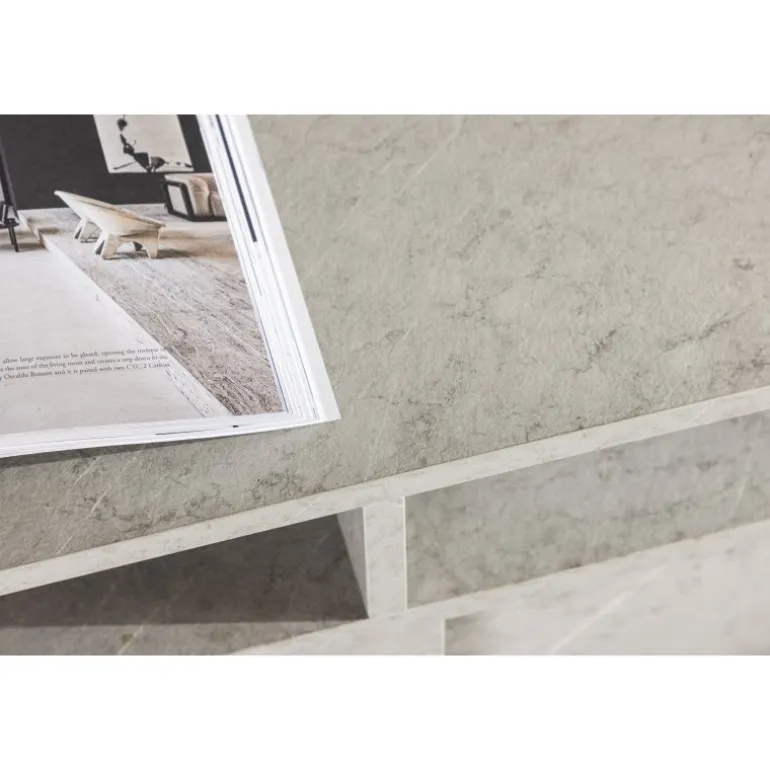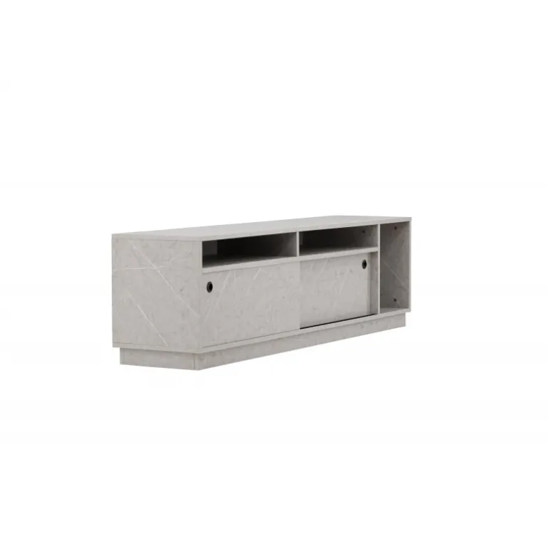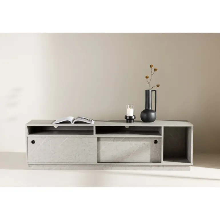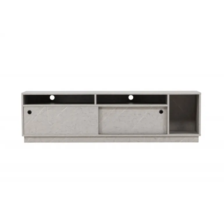 Skab en behagelig atmosfære i din stue med vores TV-reol i grå betonlook fra Girona-serien! Med sit sofistikerede udseende og holdbare overflade af grå melamin, løfter Girona ikke kun dit interiørdesign, men forbedrer også din oplevelse af at organisere dit rum. Girona TV-reolen kombinerer funktion og stil på en måde, der får dig til at føle dig som en designekspert. De to skydedøre, elegant designet, skjuler en rummelig hylde, der nemt rummer dine opbevaringsbehov. Hvordan ville det være at have alle dine enheder, kabler og fjernbetjeninger gemt væk bag dette elegante skab? Der er også åbne hylder, der giver dig mulighed for at vise dine yndlingsting frem og tilføje et personligt præg til dit værelse. Topoverfladen er også perfekt til at skabe den rette stemning i dit rum. Placer stilfulde lysestager og højttalere på toppen og nyd den ultimative TV-oplevelse i en atmosfære, du selv har skabt. Velkommen til et nyt niveau af interiørdesign med Girona!
