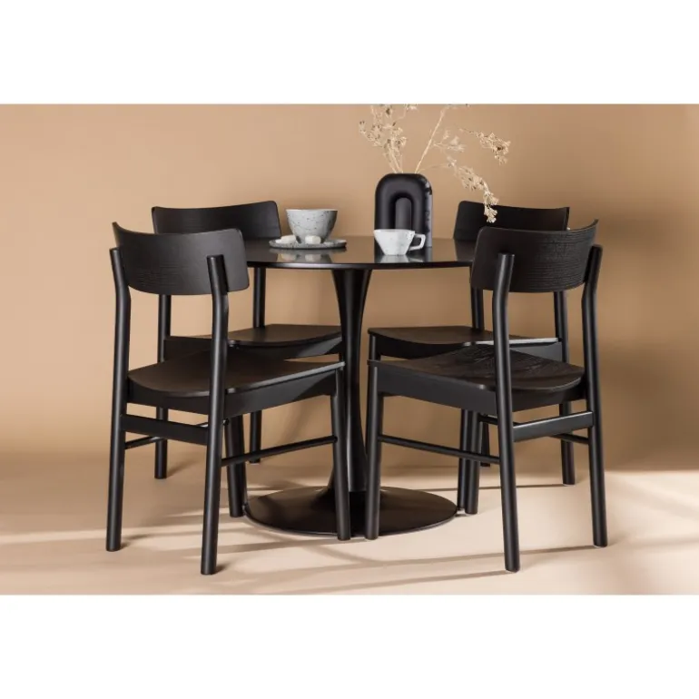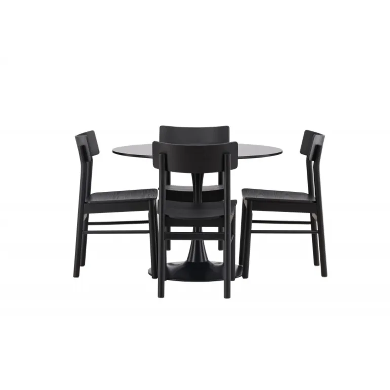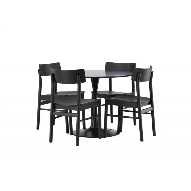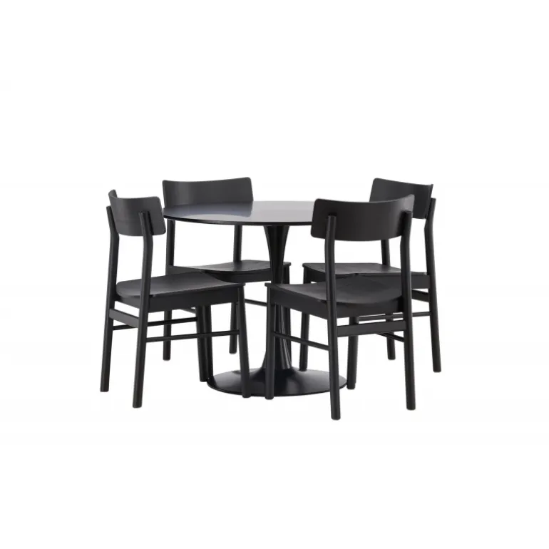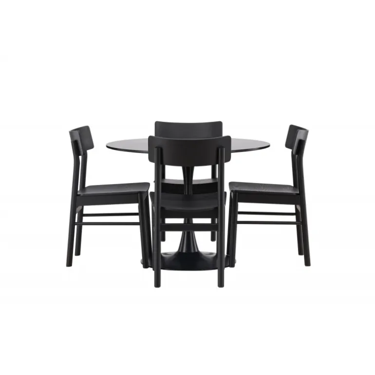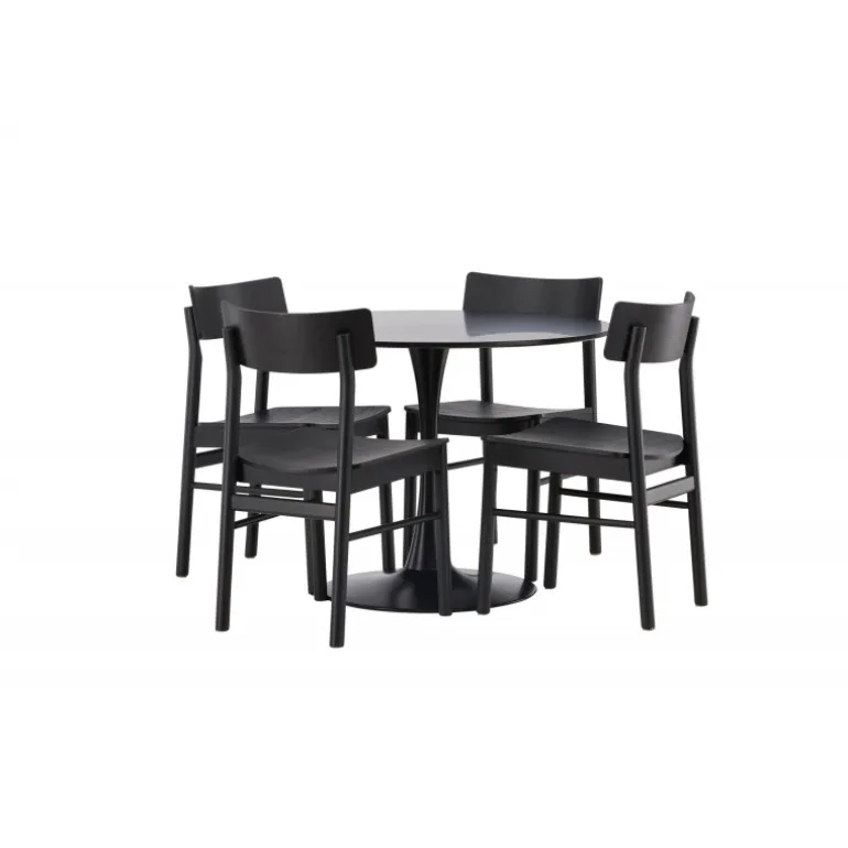 Oplev det stilfulde spisebordssæt, der vil forvandle din spisestue til et elegant og indbydende rum til måltider og sammenkomster. Med vores Glade bord og Montros stole får du både stil og funktionalitet. Glade bordet har en generøs diameter på 100 centimeter og er lavet af MDF-materiale med robuste stålben, der giver stabilitet. Den elegante sorte farve tilføjer et strejf af modernitet og sofistikering til din spisestue. Montros stolene er både stilfulde og komfortable, perfekte til lange øjeblikke ved spisebordet. Deres sorte farve og birkeramme giver et tidløst og elegant udseende til hele spisebordssættet. Uanset om det er et intimt måltid med familien eller en festlig sammenkomst med venner, tilbyder vores spisebordssæt det perfekte sted til alle lejligheder. Opgrader din spisestue i dag og lad vores spisebordssæt blive en central del af dit hjem.