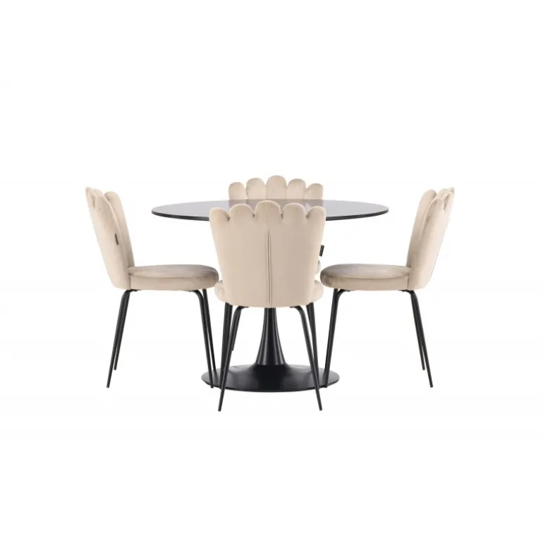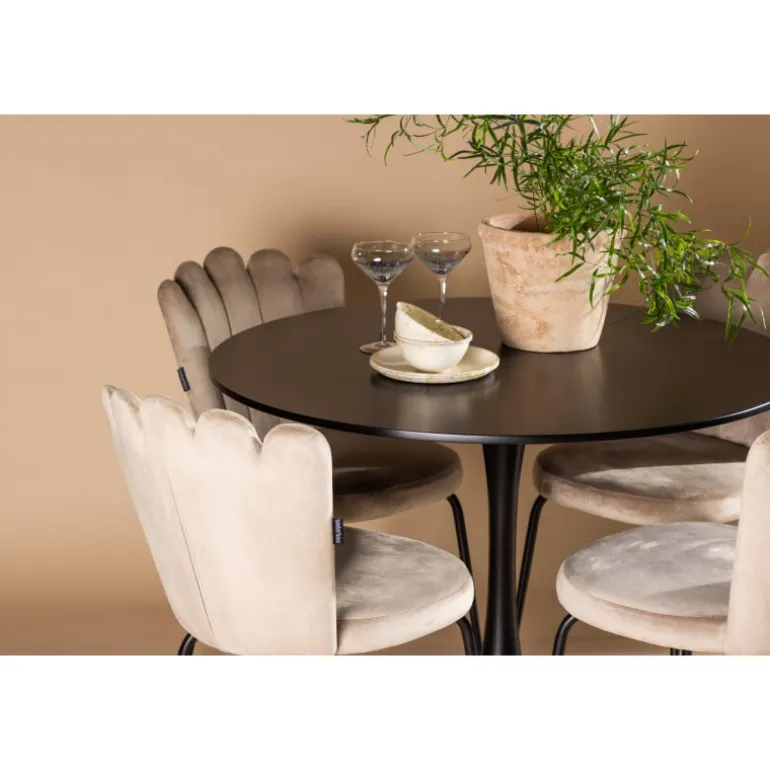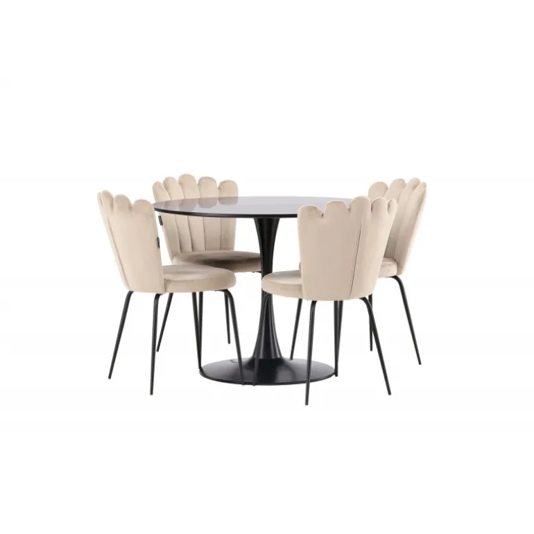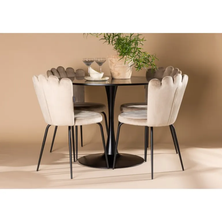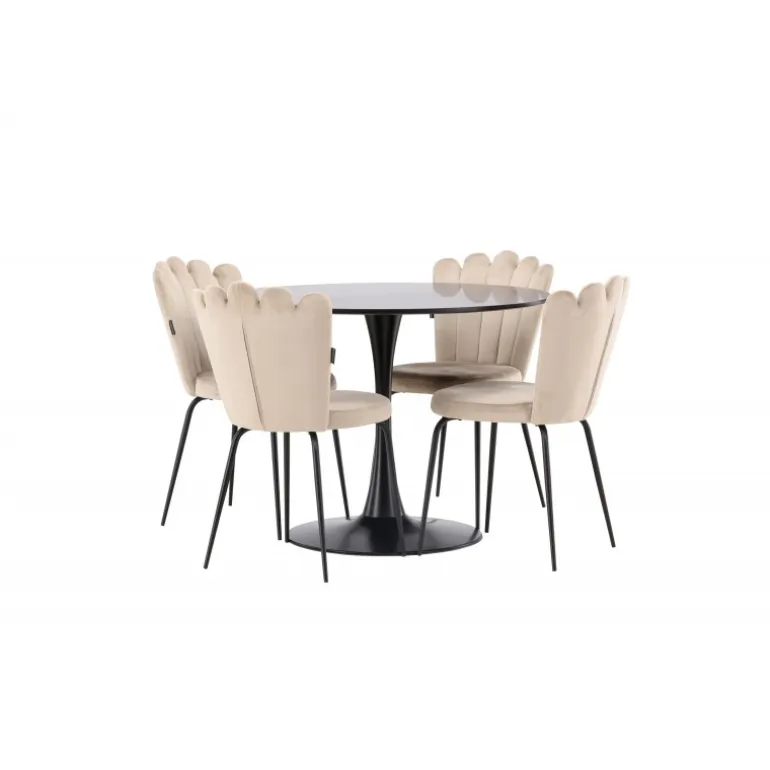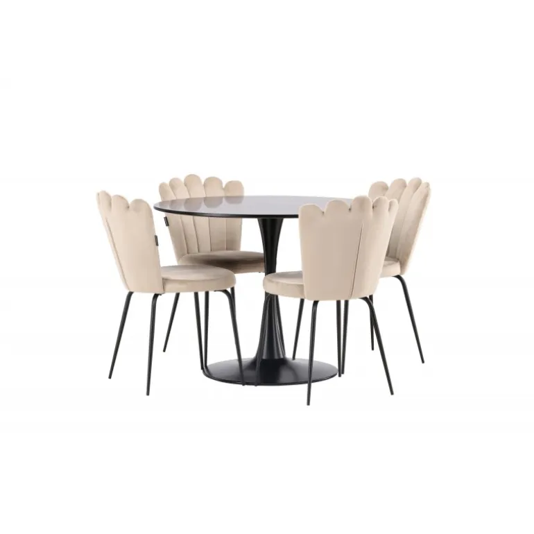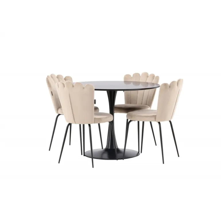 Skab en elegant blikfang i stuen! Glade spisebord har et stilfuldt skandinavisk design med en slank trompetfod i sort stål og en sort bordplade i MDF. Her sammen med vores populære spisebordsstole fra Limhamn-serien. Stolen har et indbydende design med dekorativ ryg i skaldform med dekorative syninger og et rundt sæde i smagfuldt beige fløjlsstof. Benene er i sort pulverlakeret metal. Her kan du sidde komfortabelt! Bordets dimensioner: 100 cm.