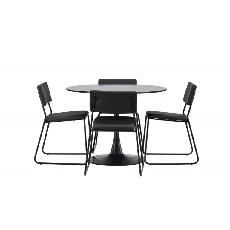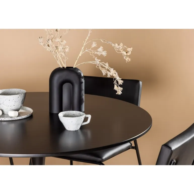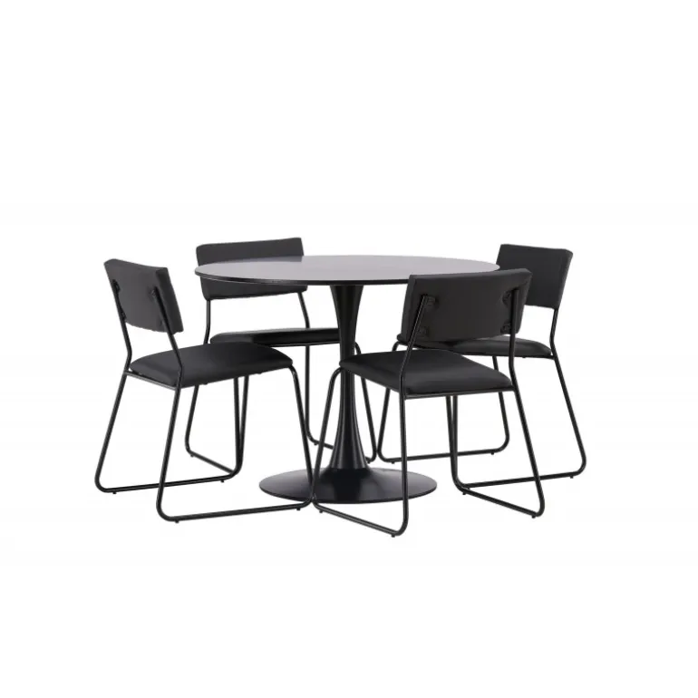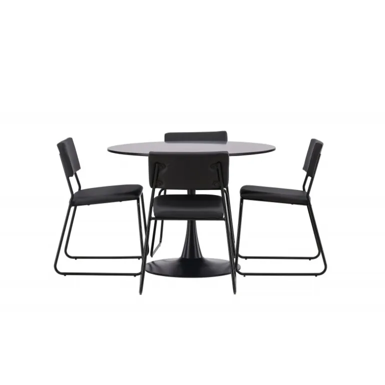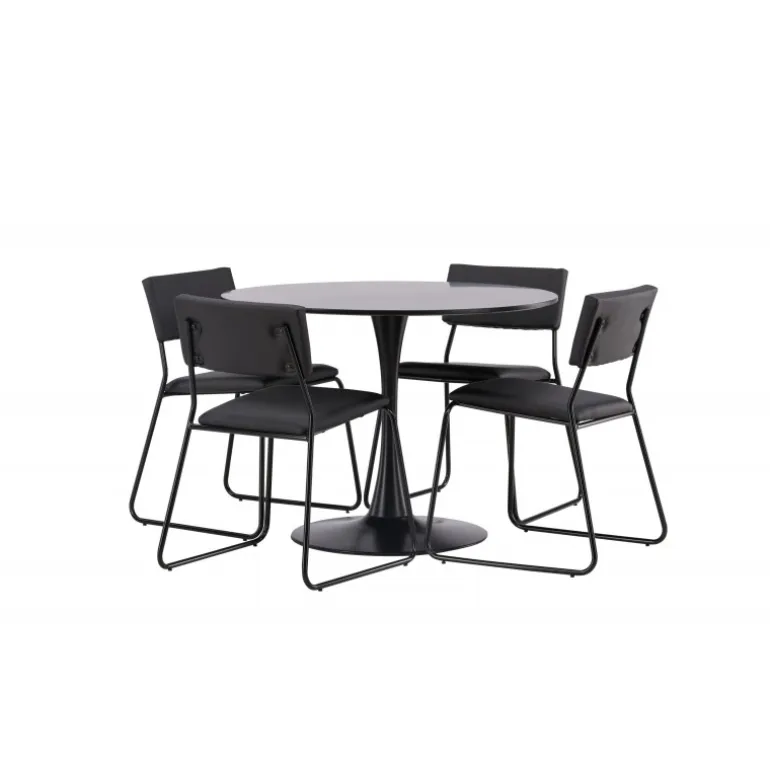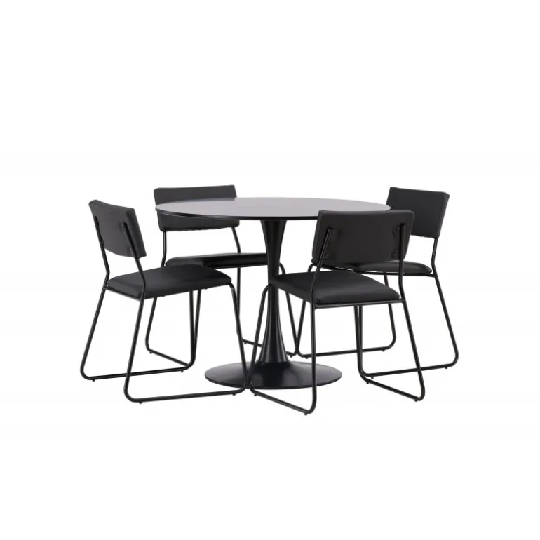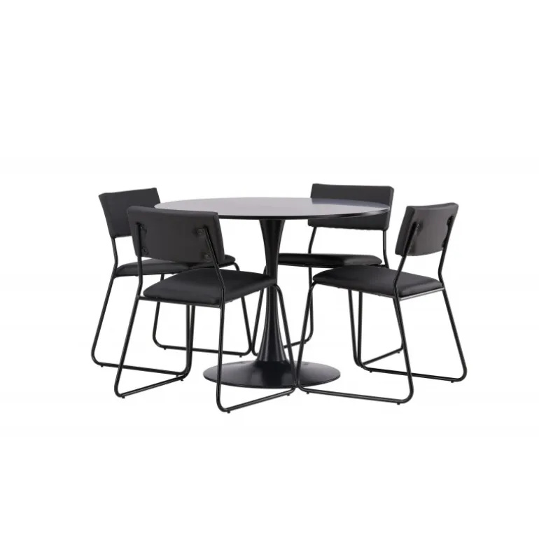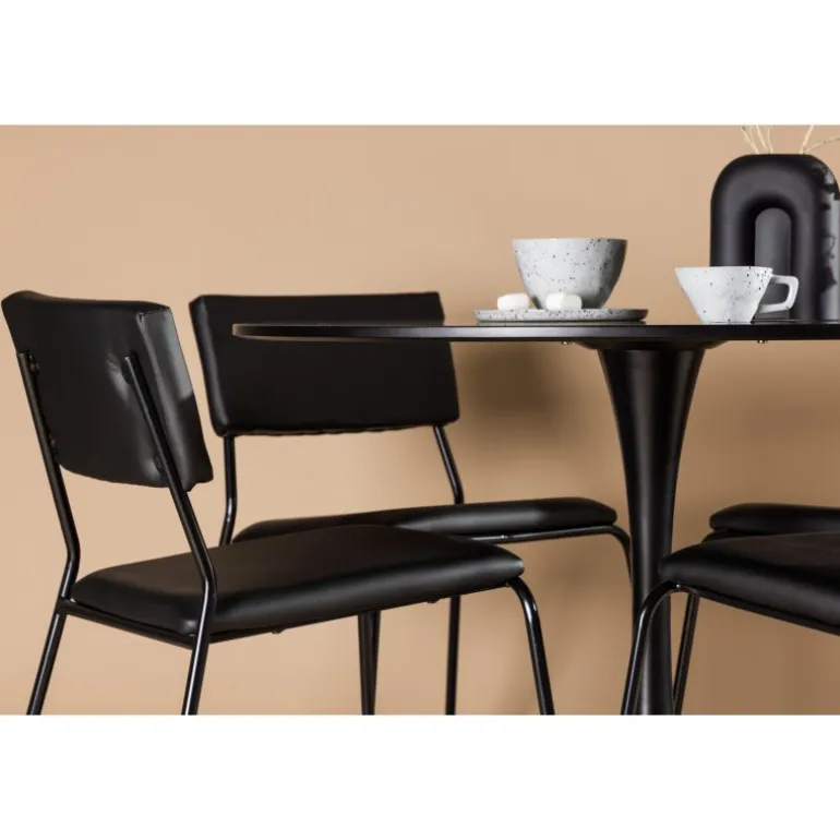 Minimalistisk og tidsløst – et Spisebordssæt med alle de rigtige funktioner! Glade spisebordet har et stilfuldt skandinavisk design med en slank trumpetfod i sort stål og en sort bordplade i MDF. Her sammen med vores sorte spiseborde fra Kenth-serien. Det minimalistiske, moderne design skaber en luftig følelse. Stolen har en ryg og sæde i sort polyurethanlæder og polyester samt dekorative smalle ben i jern. Dekorer hjemmets hjerte tidløst og stilfuldt! Bordets dimensioner: 100 cm.