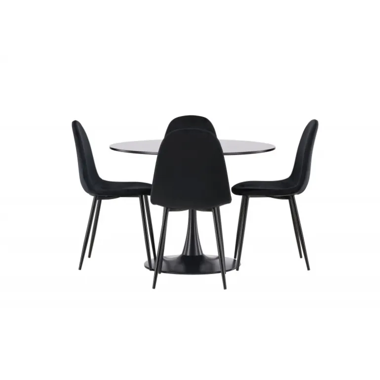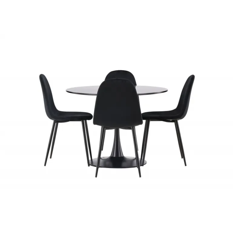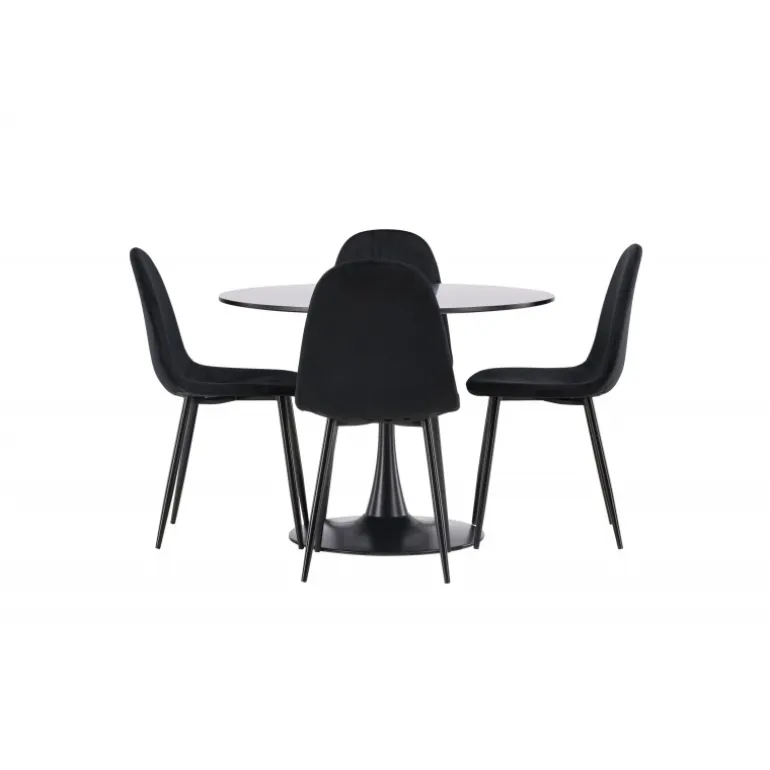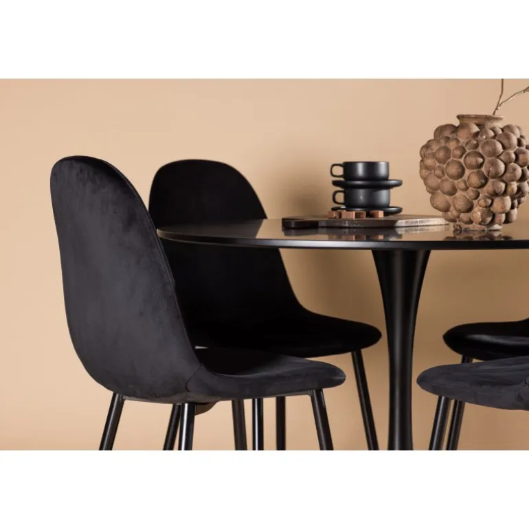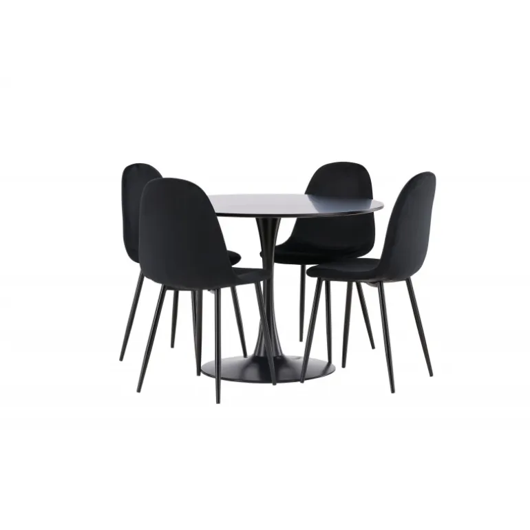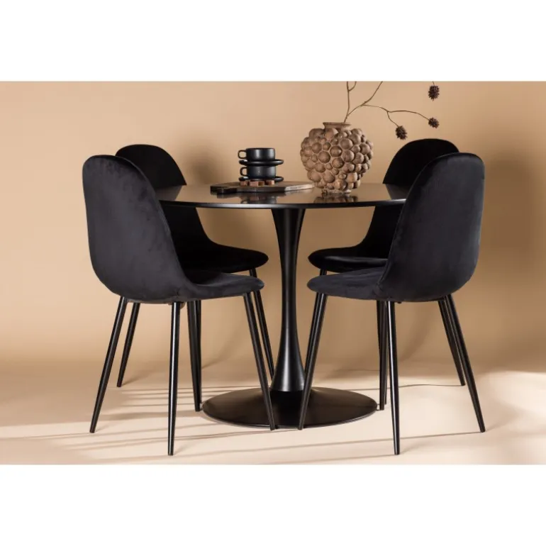En sort Spisebordssæt med elegant glans! Glade spisebord har et stilfuldt skandinavisk design med en slank trompetfod i sort stål og en sort bordplade i MDF. Her i en elegant kombination med sorte spisebordsstole fra Polar serien. Stolen har et fuldt polstret design, ben i sort pulverlakeret metal og rundet ryg og sæde i sort fløjlsstof med blødt polstring. Undgå at gå på kompromis mellem komfort og design! Bordets diameter: 100 cm.