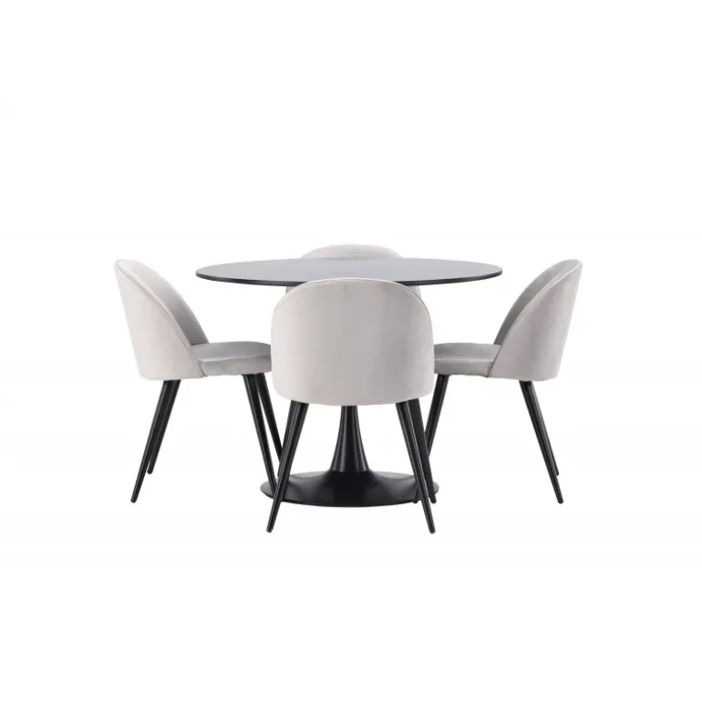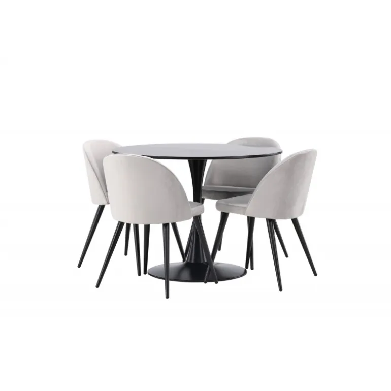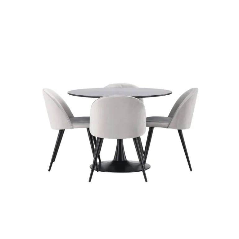Kombiner behagelige farver med bløde former! Spisebordet Glade har et stilfuldt skandinavisk design med en slank trompetfod i sort stål og en sort bordplade i MDF. Her i perfekt kombination med vores grå spisebordsstole fra Velvet-serien. Stolen har et fuldt polstret design, ben i sort pulverlakeret metal og afrundet ryg og sæde i gråt velourstof med blød polstring. Her sidder du komfortabelt i lang tid! Bordets dimensioner: 100 cm.