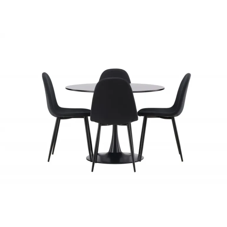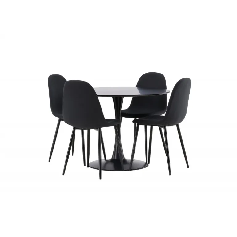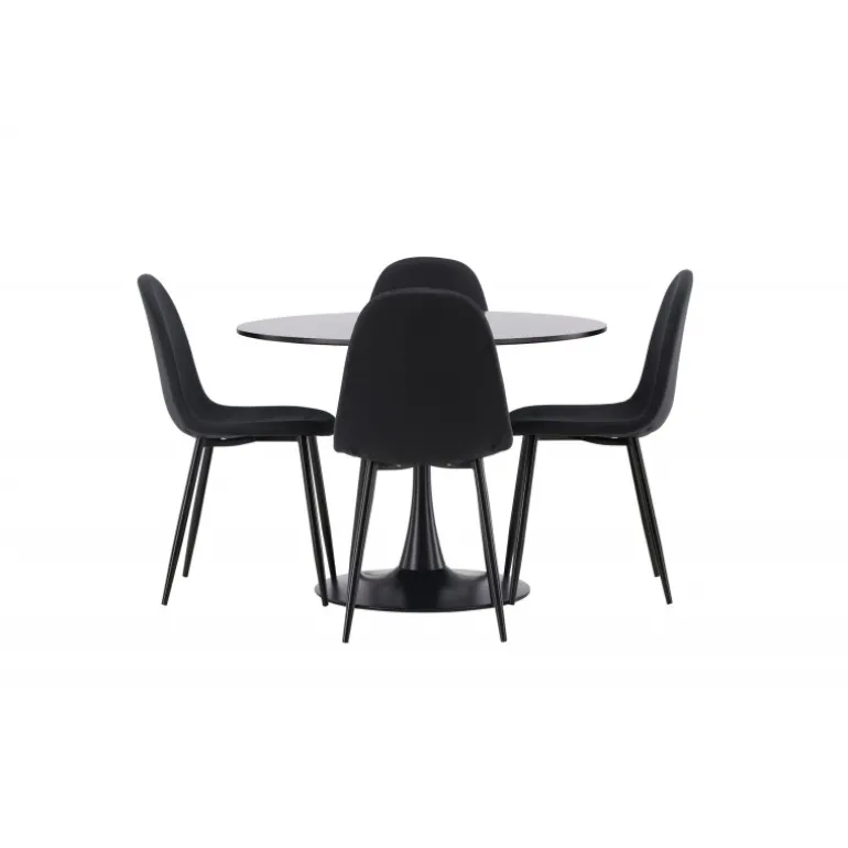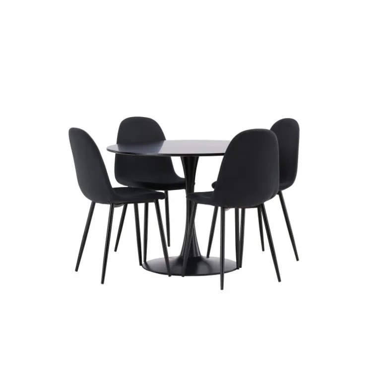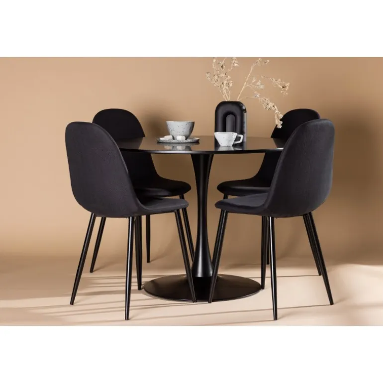Glade Rundt Spisebordssæt har et stilfuldt skandinavisk design med en slank trompetfod i sort stål og en sort bordplade i MDF. Bordet er kombineret med sorte spisebordsstole fra Polar-serien. Stolen har et afrundet design med et klassisk udseende – lige så praktisk som tidløst. Ryglæn og sæde er polstret i sort polyesterstof og benene er i sort pulverlakeret metal. Her får du et matchende, komplet Spisebordssæt til stuen eller køkkenet! Bordets dimensioner: 100 cm.