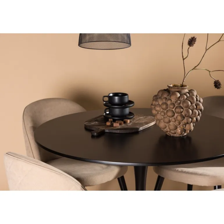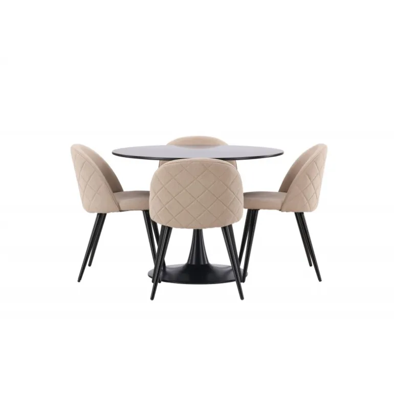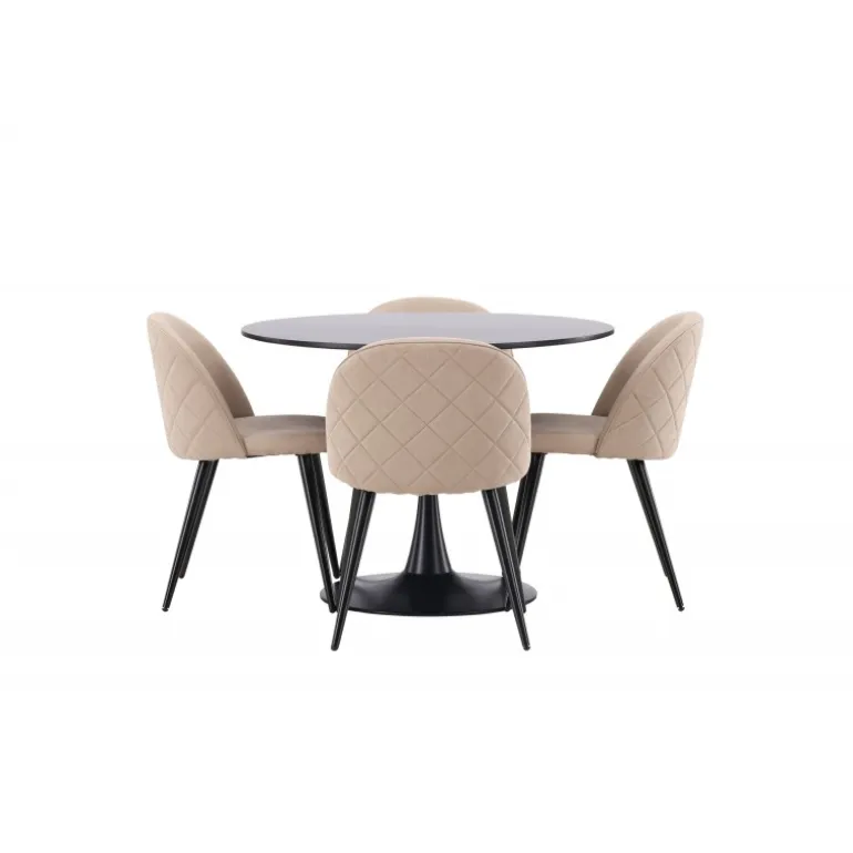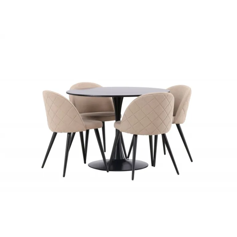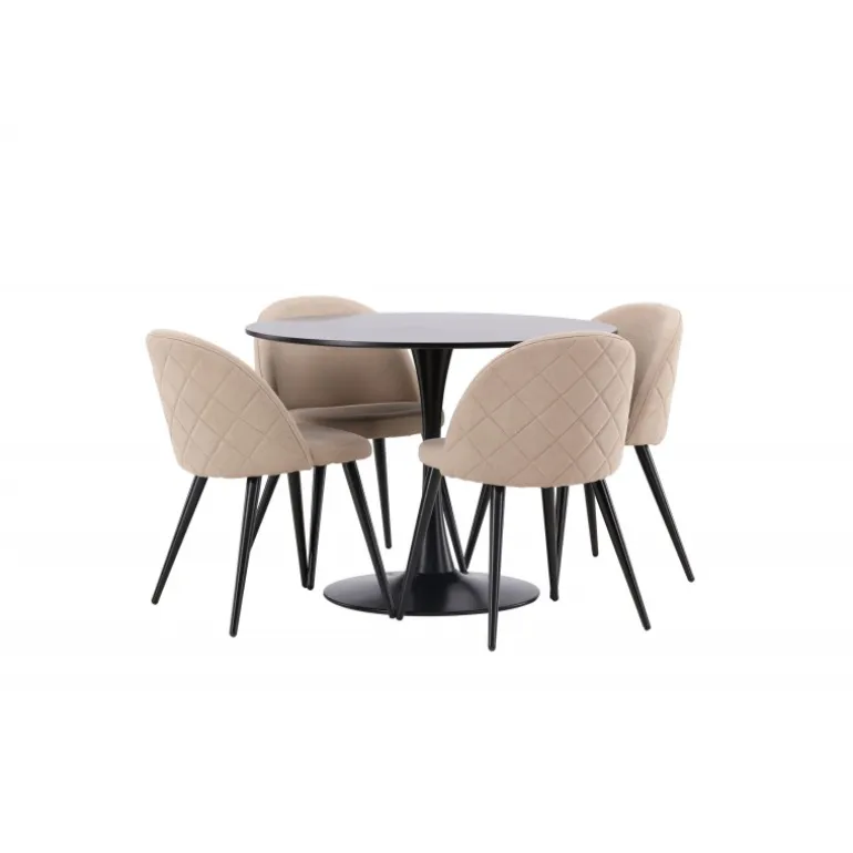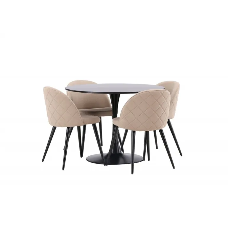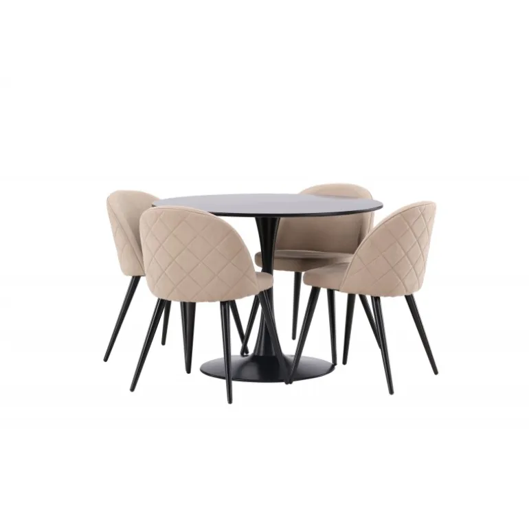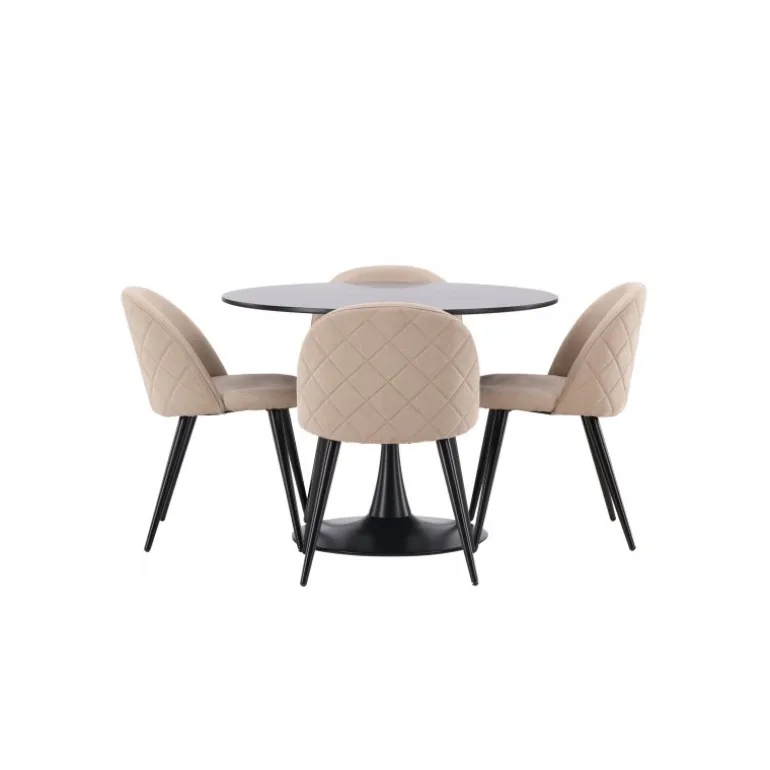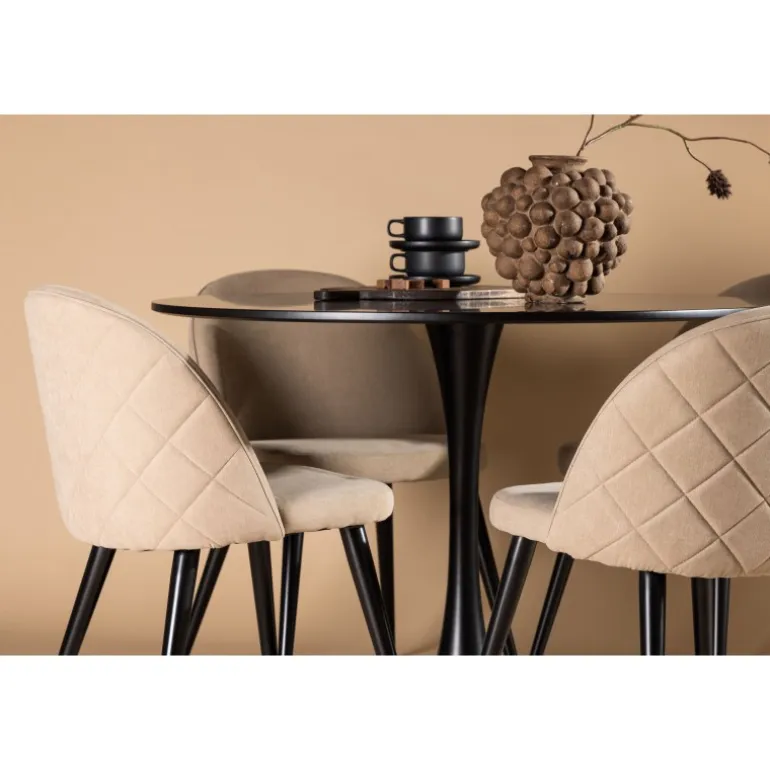 Det handler om detaljerne! Glade spisebord har et stilfuldt skandinavisk design med en slank trompetfod i sort stål og en sort bordplade i MDF. Her i en moderne kombination med spisestole fra Velvet Stitches-serien. Stolens ryg er afrundet og lige som sædet, er den blødt polstret i beige fløjl og polyester linned med dekorative syninger og skakternsmønstre på ryggen. Benene er let udadgående i sort jern og giver et solidt indtryk. Så moderne som det er komfortabelt! Borddimensioner: 100cm.