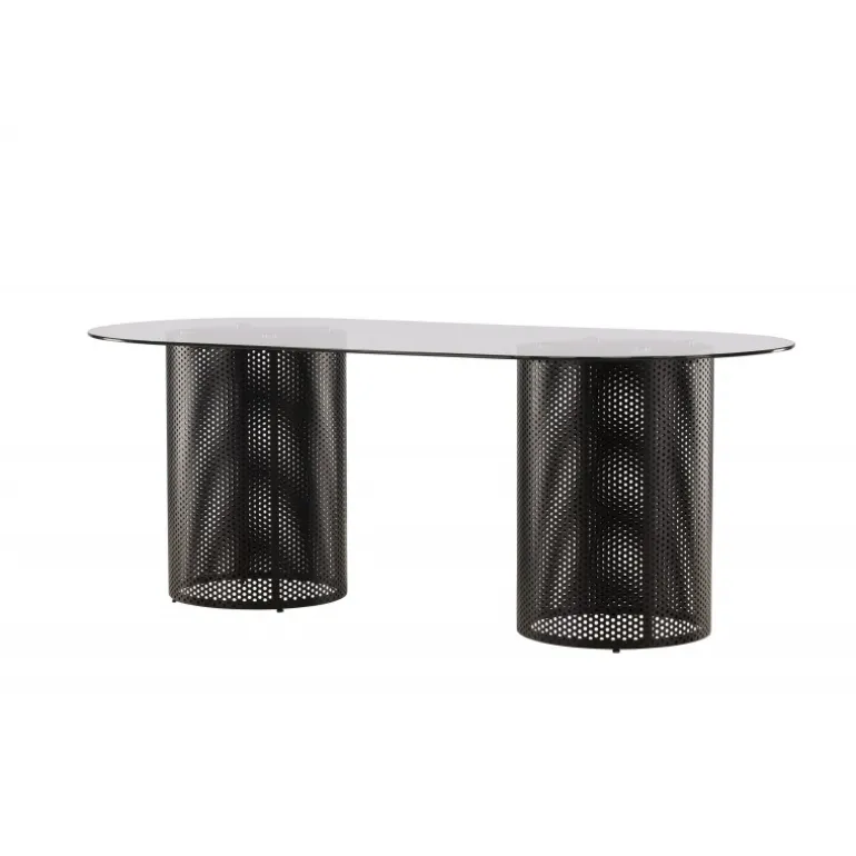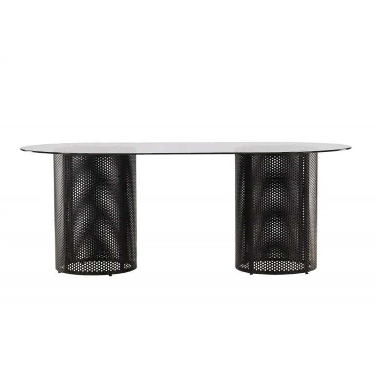 Det moderne spisebord, der imponerer! Dette spisebord fra Glasgow-serien tilhører den sjove kollektion og er både gennemtænkt og iøjnefaldende. Ovalt spisebordpladen er oval i klart glas, hvilket giver en luksuriøs elegance til helhedsindtrykket. De to cylinderformede ben er robuste i sort stål og har et smagfuldt industrielt design, der fanger øjet. Match med et par stilfulde spisebordsstole, og du får en komplet Spisebordssæt til fremtidige måltider!