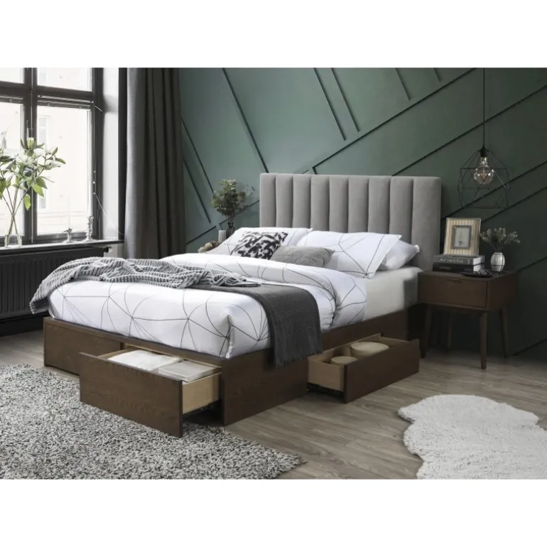 - Moderne Design: Stilfuldt grå stof og naturlig valnød træfinish passer til ethvert soveværelse.