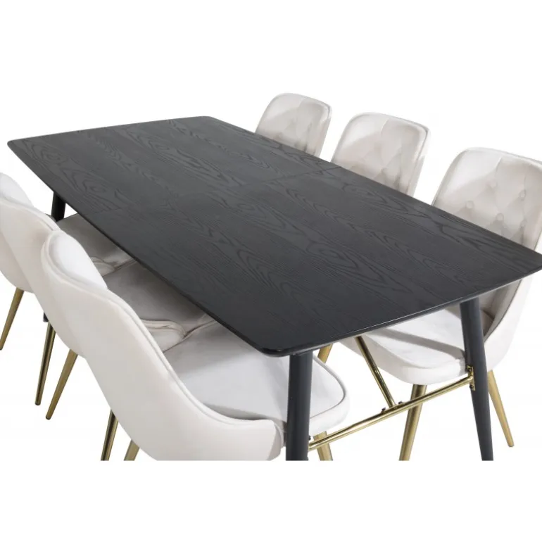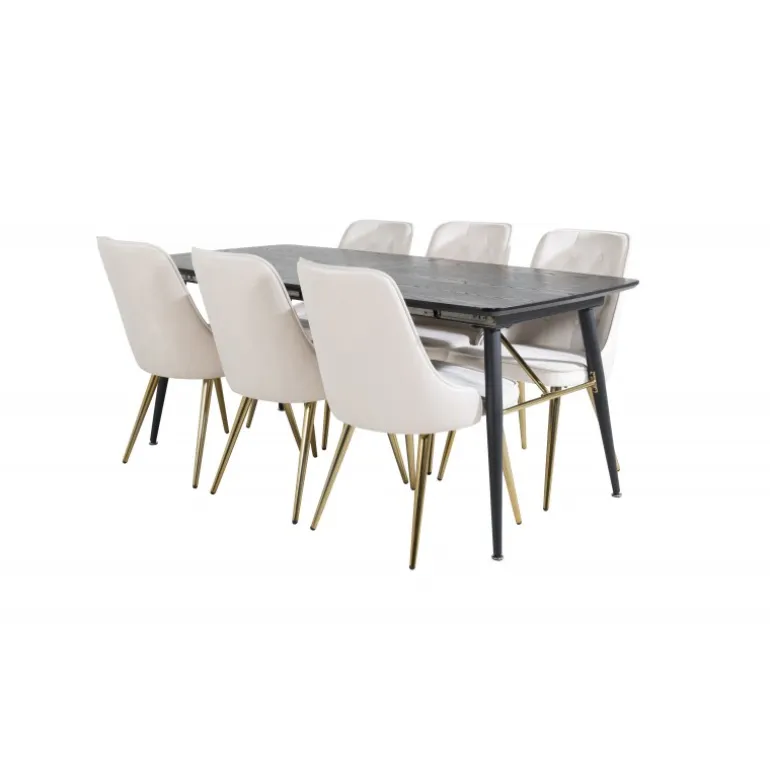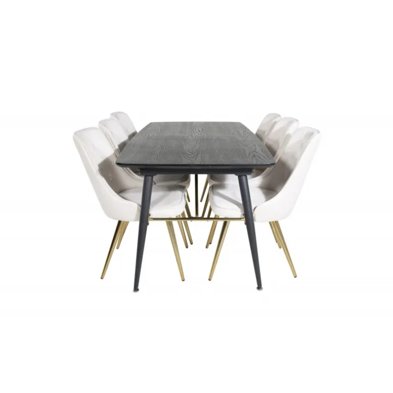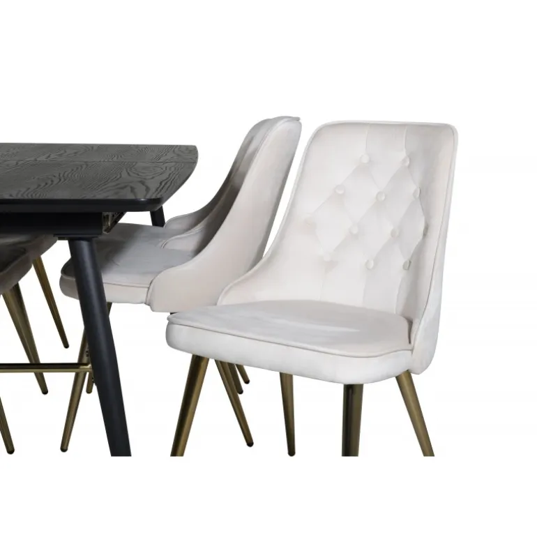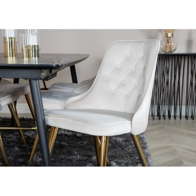 Køb af et forudsamlet spisebordssæt er både trendsikkert og praktisk! Her kombinerer vi vores udtrækkelige spisebord Guld med vores komfortable beige spisebordsstole Velvet. Lad hjemmets hjerte blive præget af din nye iøjnefaldende Spisebordssæt.