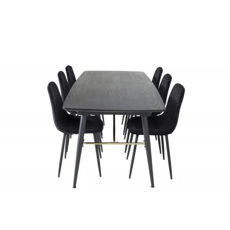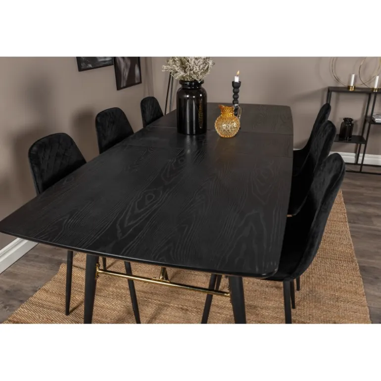 Spisebordet Guld har stilfulde gulddetaljer i bunden og er udvideligt. Her er bordet kombineret med luksuriøse stole i Polar-serien. Inviter til mange hyggelige og lange familiemiddage fremover!