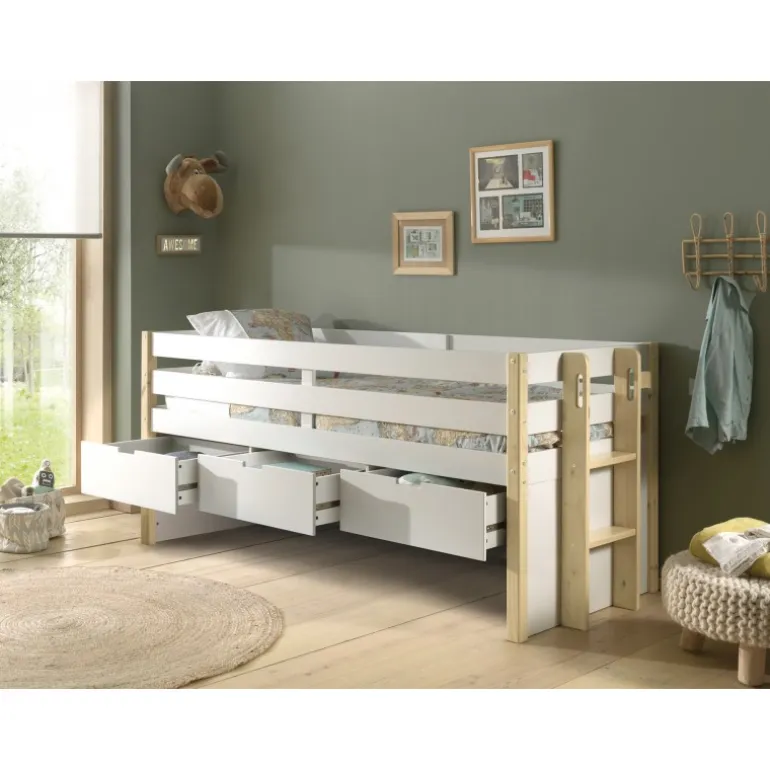 - Pladsbesparende halvhøj seng med integreret opbevaring